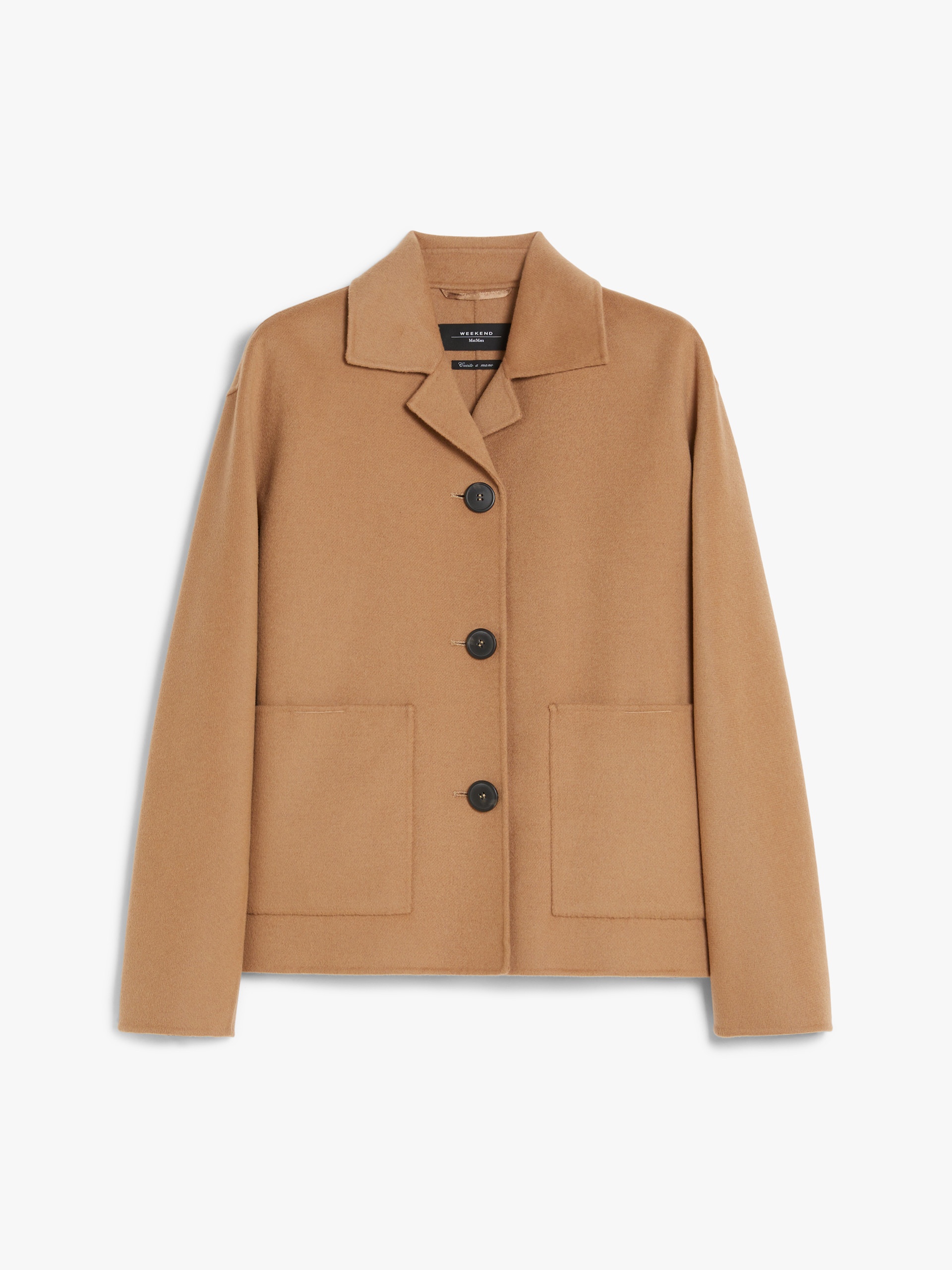 DETAILS Relaxed-fit jacket in fine hand-sewn double-faced wool fabric. The model boasts a small lapel collar, kimono sleeves and patch front pockets. Small side slit-embellished hem. Single-breasted fastening with tonal covered buttons. COMPOSITION AND CARE Fabric 90% virgin wool, 10% polyamide; - except joining thread. Do not wash; do not bleach; do not tumble dry; cool iron; professionally dry clean perchloroethylene - mild process; do not wet clean. Distributed by Max Mara S.r.l., registered office in Reggio Emilia (Italy), Via Giulia Maramotti 4, 42124 (IT)