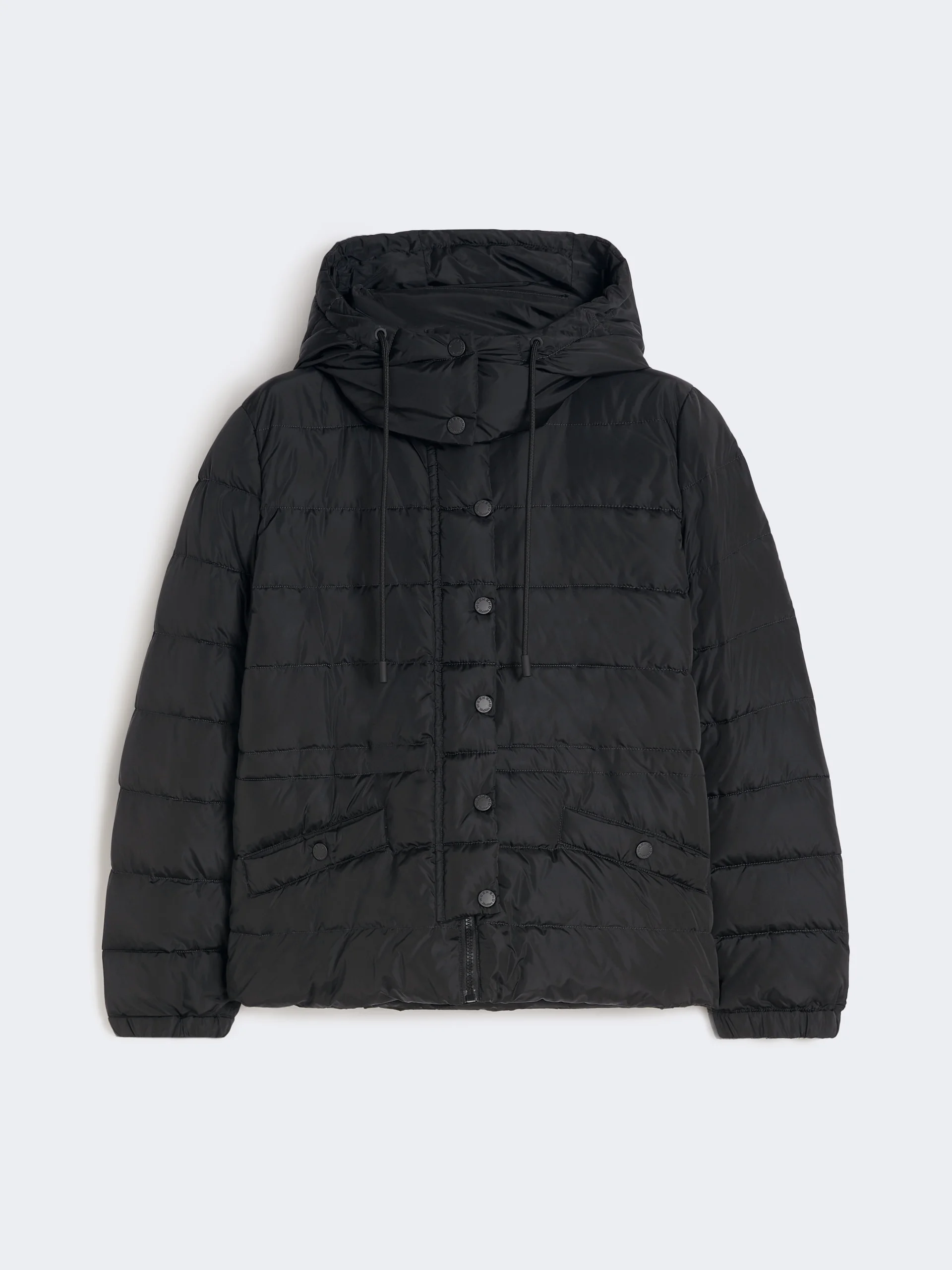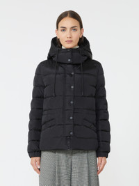DETAILS Short, quilted goose down jacket with horizontal all-over stripes. Water-repellent nylon taffeta down jacket Slim-fit style High neck with removable drawstring Long, set-in sleeves with elasticated cuff Concealed zip fastening and snap buttons Horizontal welt pockets with snap button Adjustable internal drawstring at the waist COMPOSITION AND CARE Fabric 100% polyamide; lining 100% polyamide; - exclusive of decoration; with quilting virgin down. Do not wash; do not bleach; do not tumble dry; cool iron; professionally dry clean perchloroethylene - mild process; do not wet clean.; wash the garment while it is fastened.; don’t iron the labels.; protect zipper tongue and slide before cleaning.; protect the ends stoppers and/or the cord ends before washing.; contains non-textile parts of animal origin. Distributed by Max Mara S.r.l., registered office in Reggio Emilia (Italy), Via Giulia Maramotti 4, 42124 (IT)