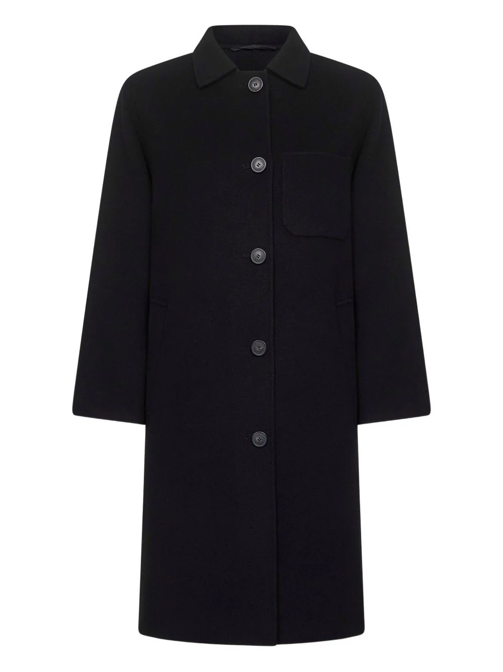 single-breasted coat Highlights - Black - Front button fastening - Pointed collar - Long sleeves - Side welt pockets - Patch chest pocket - Martingale belt - Central back slit Imported Composition Virgin Wool 100% Washing instructions Read Manufacturer Guidelines