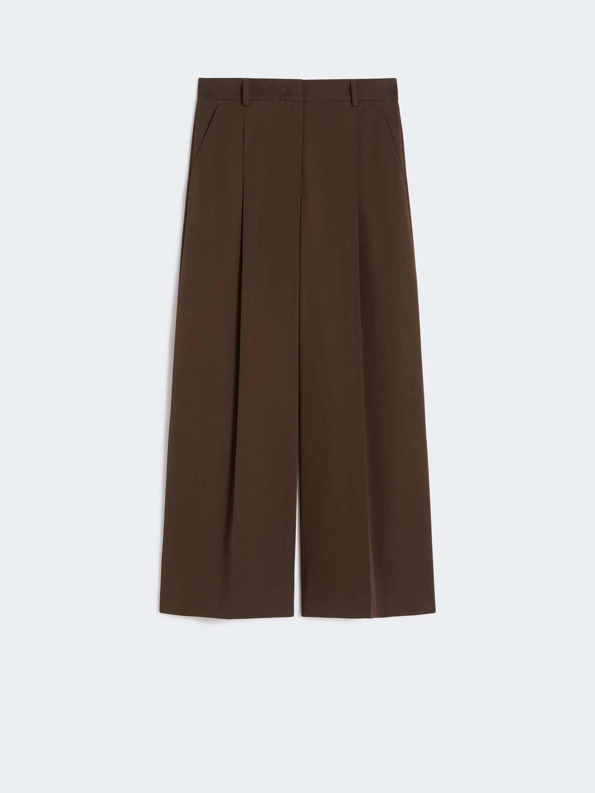 DETAILS Wide-leg trousers with cropped cut to the ankle and pleats on the front waist. - Regular fit with wide leg - Stretch cotton gabardine trousers - Fastening with a wide waistband tab, zip fly and small hook - Slant pockets at the sides - Welt pockets with button at the back - Belt loops at the waist - Trouser crease - Stitched darts on the back waist COMPOSITION AND CARE 97% cotton, 3% elastane. Machine wash cold delicate cycle; do not bleach; do not tumble dry; line drying in the shade; cool iron; professionally dry clean perchloroethylene - mild process. Distributed by Max Mara S.r.l., registered office in Reggio Emilia (Italy), Via Giulia Maramotti 4, 42124 (IT) Collection: Weekend Max Mara Product code: 5131076206031 - WKDBELLICO