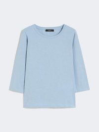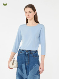 DETAILS A basic T-shirt with a versatile look. - The fabric of this item is made from at least 50% cotton fibers, grown and processed according to organic farming systems - Stretch cotton jersey T-shirt - Straight fit - Boat neckline - Set-in 3/4 sleeves - Small butterfly logo on the back of the neck COMPOSITION AND CARE 95% cotton, 5% elastane. Machine wash cold delicate cycle; do not bleach; do not tumble dry; flat drying in the shade; cool iron; do not dry clean; professional wet cleaning - very mild process.; iron with a cloth between.; using neutral detergent.; turn the articles inside out before washing.; to be ironed on reverse. Distributed by Max Mara S.r.l., registered office in Reggio Emilia (Italy), Via Giulia Maramotti 4, 42124 (IT) Collection: Weekend Max Mara Product code: 5971016106008 - WKDMULTIA