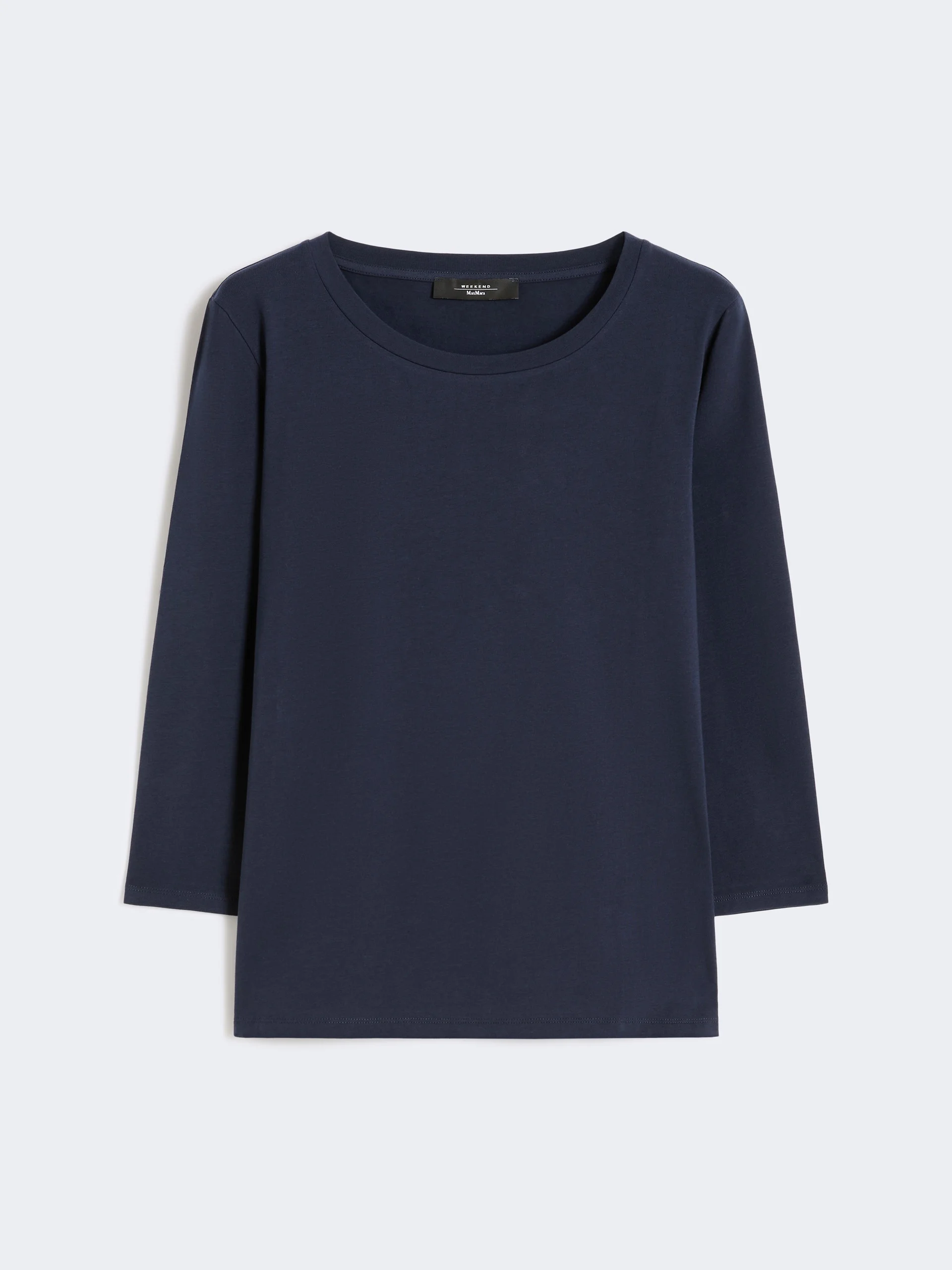DETAILS A basic T-shirt with a versatile look. - The fabric of this item is made from at least 50% cotton fibers, grown and processed according to organic farming systems - Stretch cotton jersey T-shirt - Straight fit - Boat neckline - Set-in 3/4 sleeves - Small butterfly logo on the back of the neck COMPOSITION AND CARE 95% cotton, 5% elastane. Machine wash cold delicate cycle; do not bleach; do not tumble dry; flat drying in the shade; cool iron; do not dry clean; professional wet cleaning - very mild process.; iron with a cloth between.; using neutral detergent.; turn the articles inside out before washing.; to be ironed on reverse. Distributed by Max Mara S.r.l., registered office in Reggio Emilia (Italy), Via Giulia Maramotti 4, 42124 (IT) Collection: Weekend Max Mara Product code: 5971016106004 - WKDMULTIA