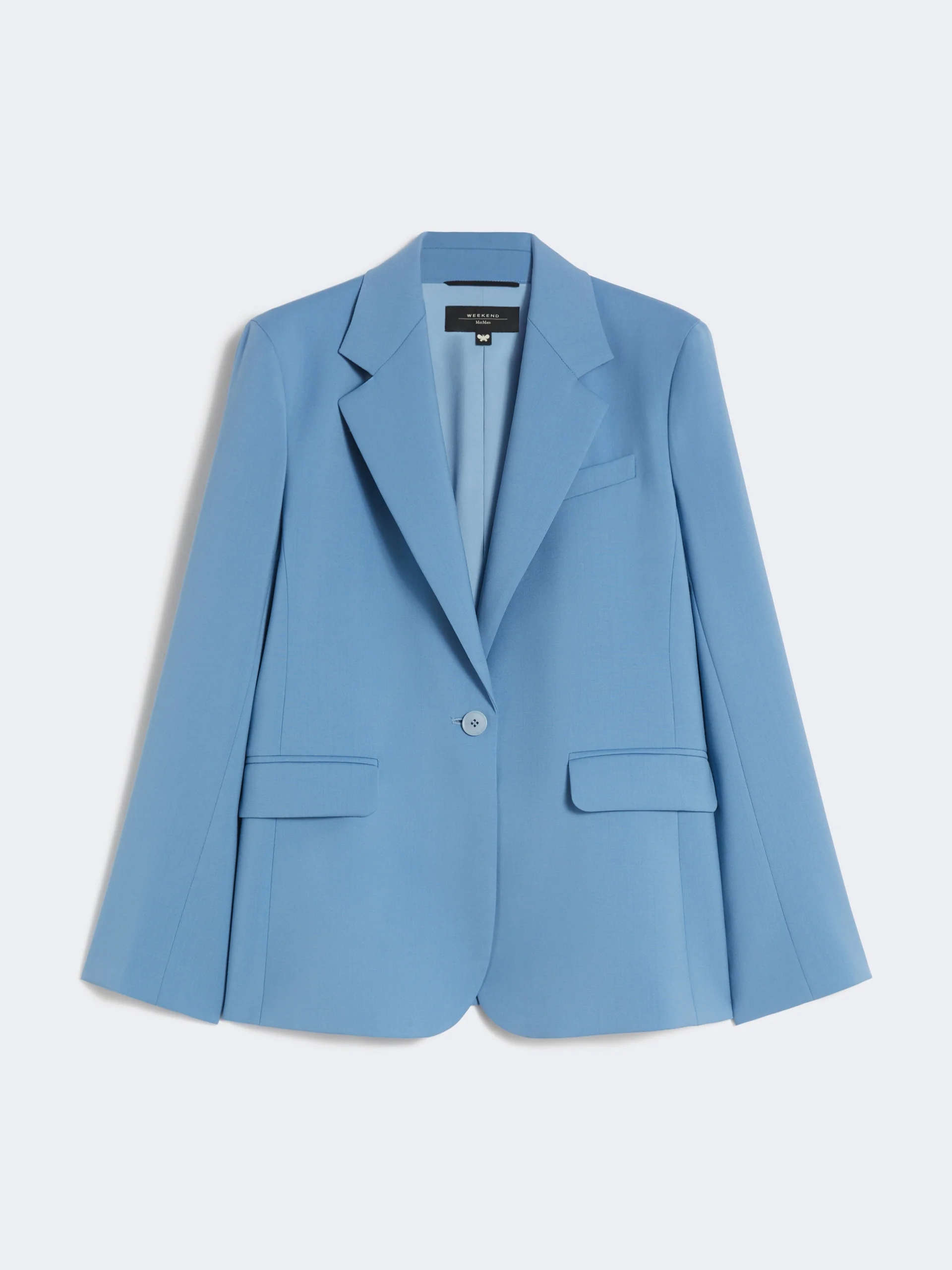 DETAILS Single-breasted blazer with tailored details. - Blazer in natural stretch pure wool fabric - Figure-skimming fit with a rear vent - Lapel collar - Long set-in sleeves with buttoned cuffs - One-button fastening - Breast pocket and flap welt pockets at the side - Lined model COMPOSITION AND CARE Fabric 100% virgin wool; lining 100% polyester. Do not wash; do not bleach; do not tumble dry; cool iron; professionally dry clean perchloroethylene - mild process; do not wet clean.; wash the garment while it is fastened.; contains non-textile parts of animal origin. Distributed by Max Mara S.r.l., registered office in Reggio Emilia (Italy), Via Giulia Maramotti 4, 42124 (IT) Collection: Weekend Max Mara Product code: 5041076106005 - WKDLAMINE