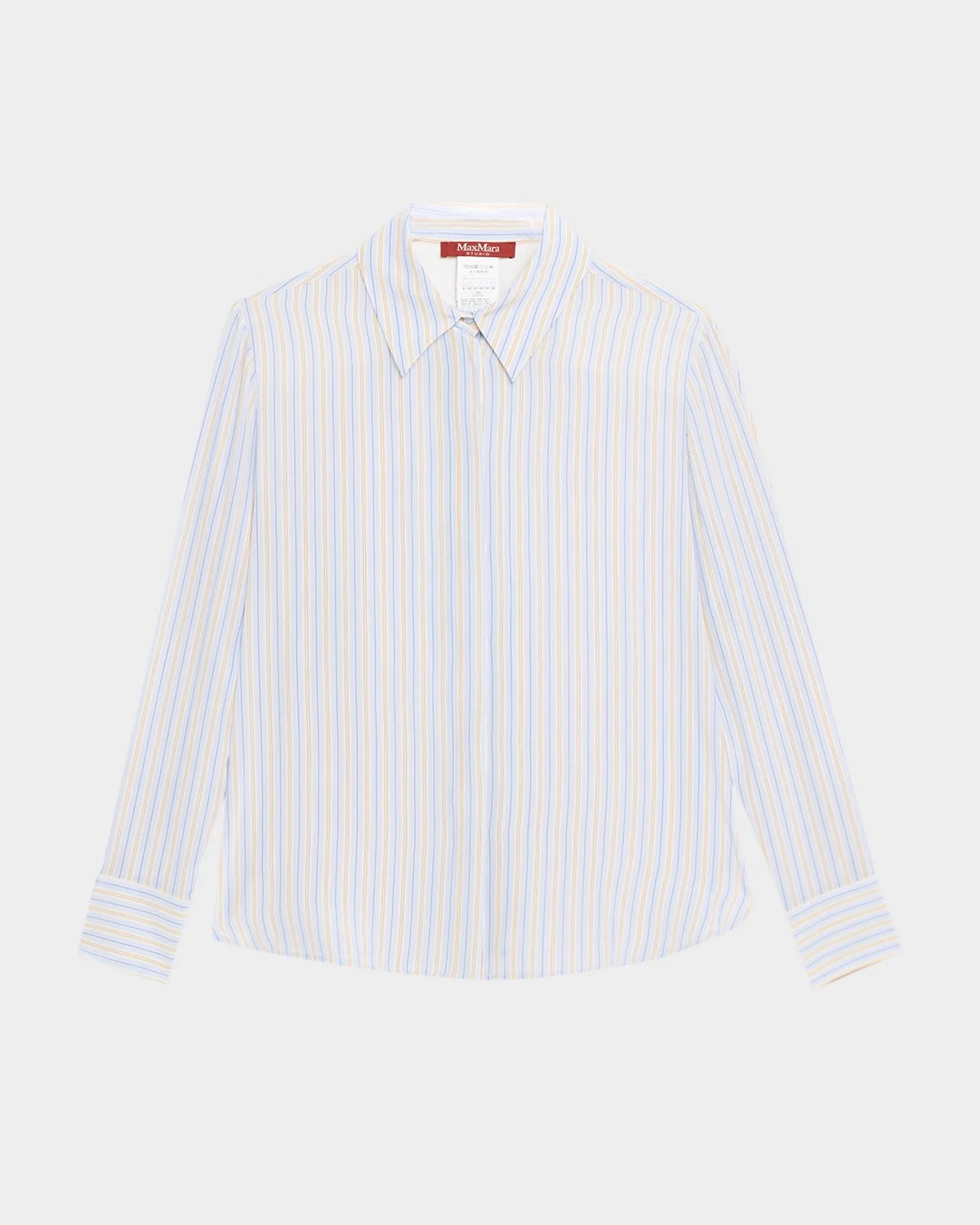 This Weekend Max Mara shirt is cut from fluid silk with horizontal stripes that add brightness to the design Spread collar; concealed button front Long sleeves; button cuffs Box-pleated back yoke Relaxed fit Silk Dry clean Made in Romania SIZE & FITModel measurements: 5 & apos;10" tallModel is wearing a US size 4/Small