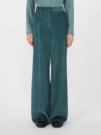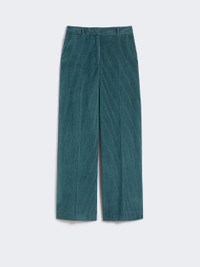 DETAILS Long trousers with a characteristic wide leg silhouette. Nine-wale cotton velvet trousers Wide leg Fastening with a wide waistband tab, zip fly and small hook Slant pockets at the sides Welt pockets at the back Belt loops and trouser crease COMPOSITION AND CARE 100% cotton. Hand wash cold (40°c max); do not bleach; do not tumble dry; line drying in the shade; cool iron; professionally dry clean perchloroethylene - mild process; do not wet clean. Distributed by Max Mara S.r.l., registered office in Reggio Emilia (Italy), Via Giulia Maramotti 4, 42124 (IT)