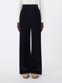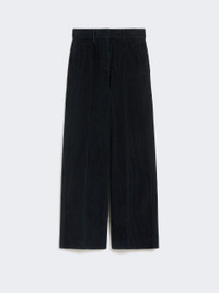 DETAILS Long trousers with a characteristic wide leg silhouette. Nine-wale cotton velvet trousers Wide leg Fastening with a wide waistband tab, zip fly and small hook Slant pockets at the sides Welt pockets at the back Belt loops and trouser crease COMPOSITION AND CARE 100% cotton. Hand wash cold (40°c max); do not bleach; do not tumble dry; line drying in the shade; cool iron; professionally dry clean perchloroethylene - mild process; do not wet clean. Distributed by Max Mara S.r.l., registered office in Reggio Emilia (Italy), Via Giulia Maramotti 4, 42124 (IT)