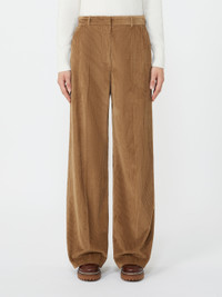 DETAILS Long trousers with a characteristic wide leg silhouette. Nine-wale cotton velvet trousers Wide leg Fastening with a wide waistband tab, zip fly and small hook Slant pockets at the sides Welt pockets at the back Belt loops and trouser crease COMPOSITION AND CARE 100% cotton. Hand wash cold (40°c max); do not bleach; do not tumble dry; line drying in the shade; cool iron; professionally dry clean perchloroethylene - mild process; do not wet clean. Distributed by Max Mara S.r.l., registered office in Reggio Emilia (Italy), Via Giulia Maramotti 4, 42124 (IT)