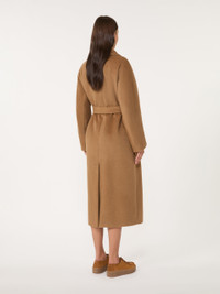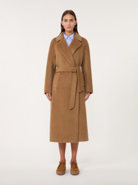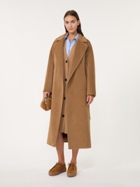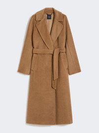 DETAILS Long coat with a robe silhouette and matching belt at the waist. Wool and alpaca blend fabric coat Flared Wide lapel collar Long kimono sleeves Welt pockets on the sides Centre slit on the back Lined COMPOSITION AND CARE Fabric 48% wool, 22% alpaca, 15% polyamide, 15% mohair; lining 50% acetate, 50% viscose. Do not wash; do not bleach; do not tumble dry; cool iron; professionally dry clean perchloroethylene - mild process; do not wet clean. Distributed by Max Mara S.r.l., registered office in Reggio Emilia (Italy), Via Giulia Maramotti 4, 42124 (IT)