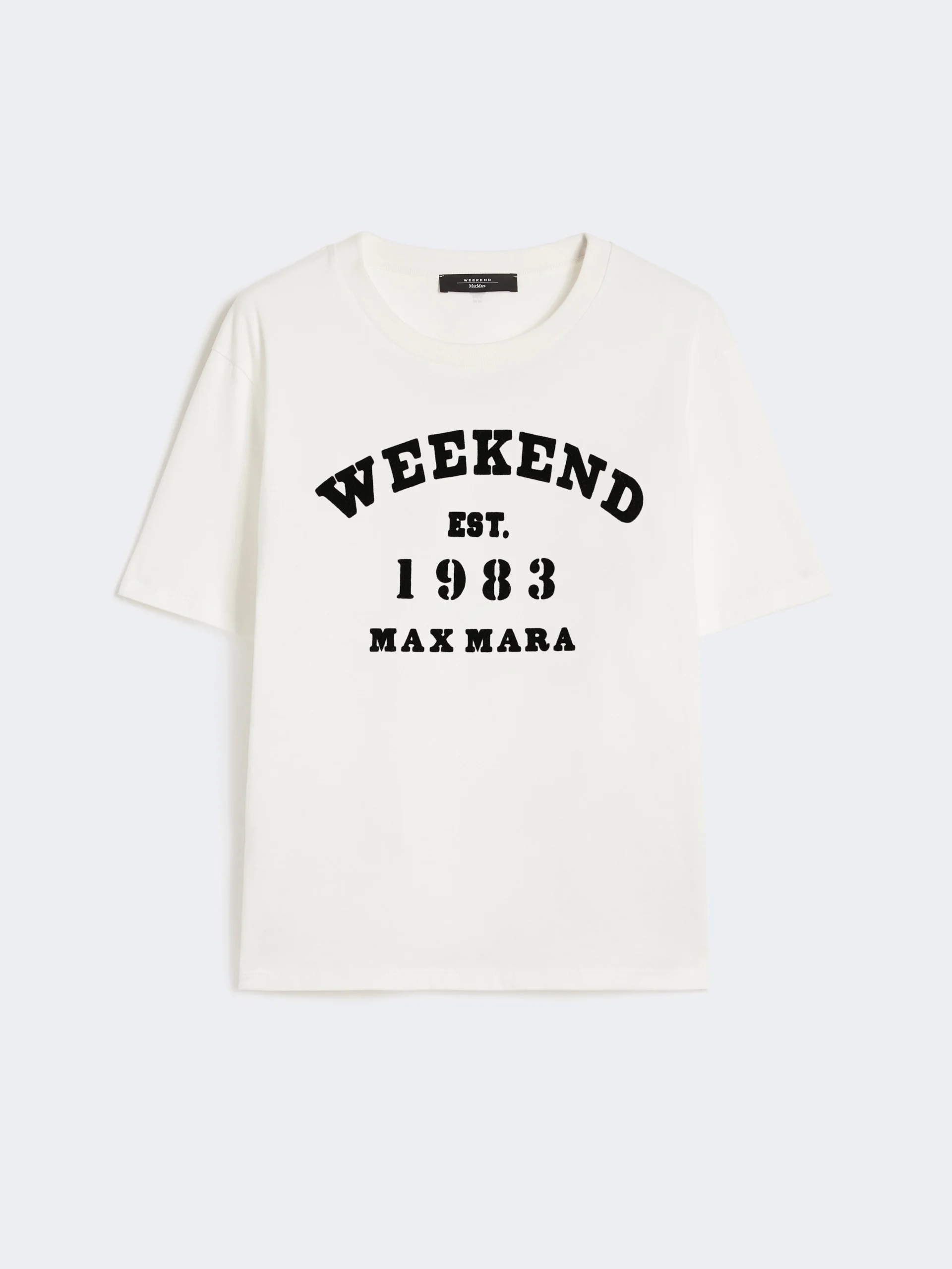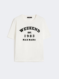 DETAILS Basic T-shirt customised with graphic motif printed on the front. - Main fabric with cotton fibers, grown and processed according to organic farming systems - Pure cotton jersey T-shirt - Straight fit with side slits - Rib-knit crew neckline - Short set-in sleeves - Small embroidered butterfly logo detail on the back of the neck COMPOSITION AND CARE 100% cotton. Hand wash cold (40°c max); do not bleach; do not tumble dry; flat drying in the shade; cool iron; do not dry clean; do not wet clean.; iron with a cloth between.; using neutral detergent.; don’t rub.; turn the articles inside out before washing.; to be ironed on reverse. Distributed by Max Mara S.r.l., registered office in Reggio Emilia (Italy), Via Giulia Maramotti 4, 42124 (IT) Collection: Weekend Max Mara Product code: 5971056106006 - WKDTENUE