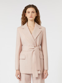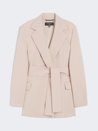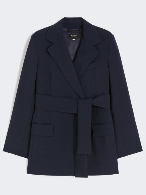 DETAILS Straight-fit jacket featuring a silhouette-accentuating tie belt at the waist. - Jacket in natural stretch pure woollen cloth - Lapel collar - Long set-in sleeves - Flap welt pockets on the front - Breast pocket - Long cuffs with deep side slit detail - Lined model COMPOSITION AND CARE Fabric 100% virgin wool; lining 50% acetate, 50% viscose; sleeves lining 65% acetate, 31% polyamide, 4% elastane. Do not wash; do not bleach; do not tumble dry; cool iron; professionally dry clean perchloroethylene - mild process; do not wet clean. Distributed by Max Mara S.r.l., registered office in Reggio Emilia (Italy), Via Giulia Maramotti 4, 42124 (IT)
