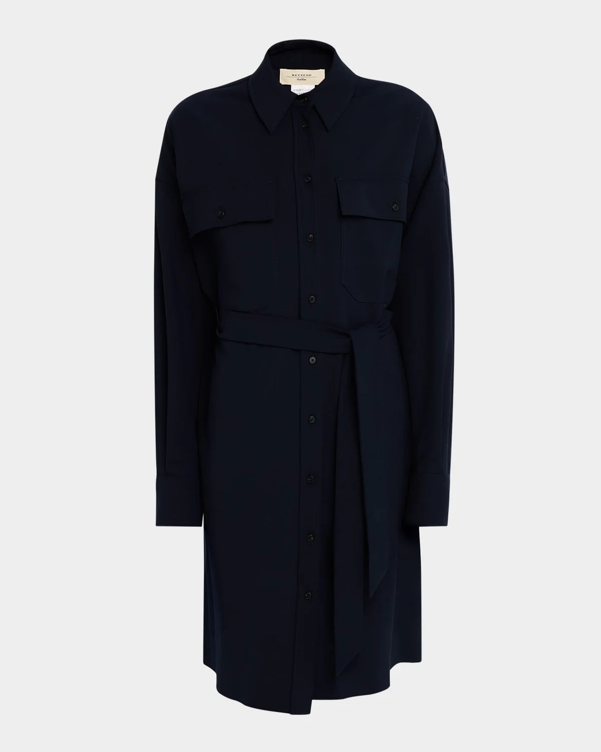 Crafted of stretch tech gabardine, the Weekend Max Mara "Tiberio" shirtdress is fitted with militaryinspired patch pockets and a matching belt Point collar; button placket Long sleeves with buttoned cuffs Dropped shoulders Yoked back Removable belt cinches the waist Two front patch pockets Two side inset pockets Straight silhouette Button front closure Polyester/virgin wool/elastane Hand wash Made in Morocco