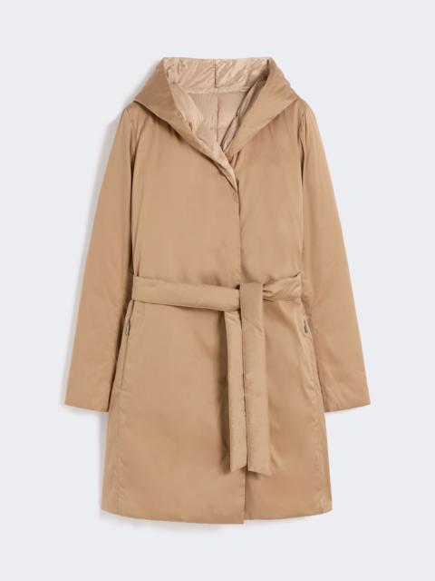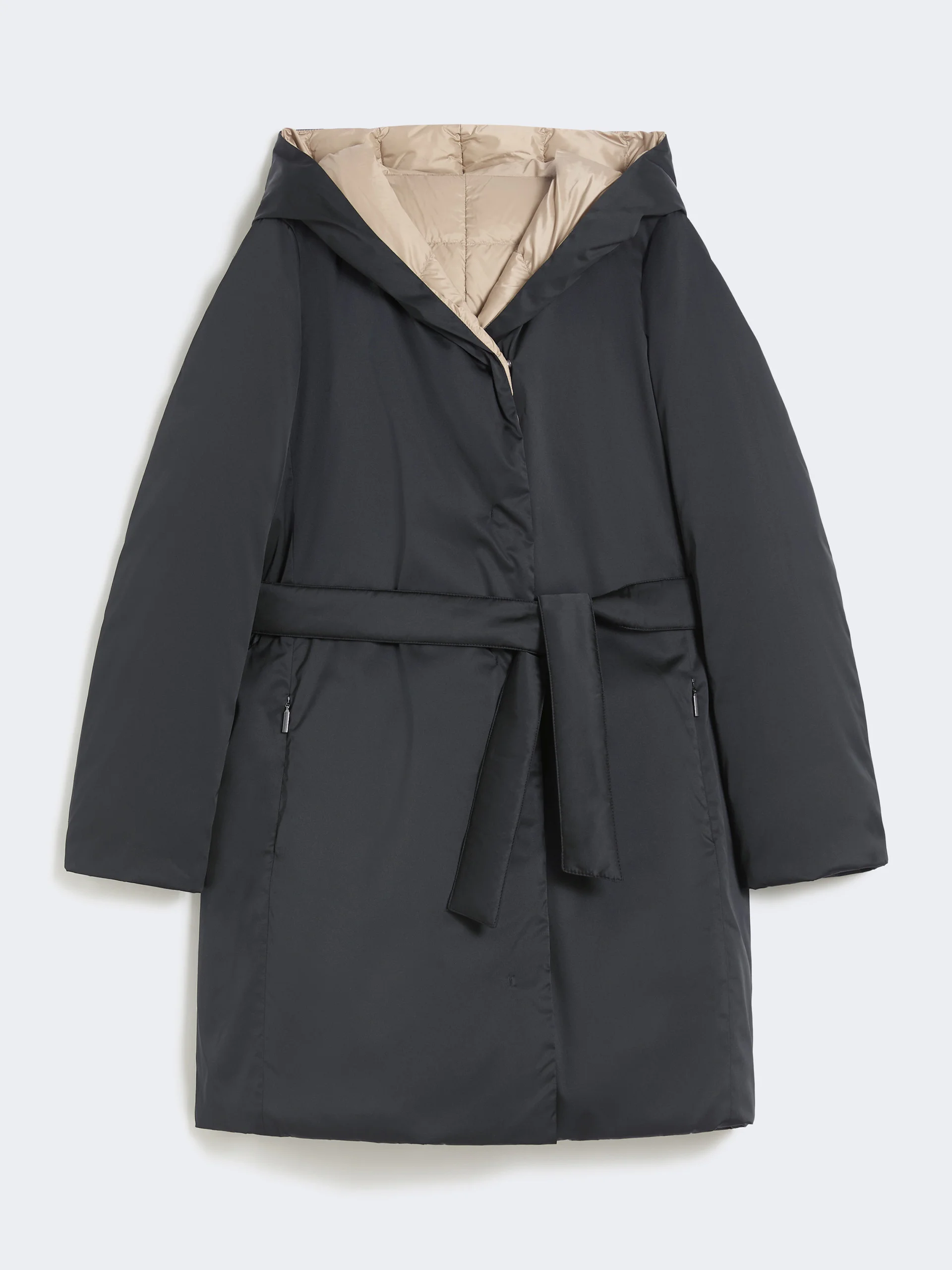 DETAILS Reversible midi down jacket: one side features an all-over quilted horizontal striped pattern, the other is completely plain Down jacket in water-repellent technical fabric Straight cut High neck with hood and set-in sleeves Snap-button fastening and matching belt Side inset pockets Goose-down padding COMPOSITION AND CARE Fabric 100% polyester; inner fabric 100% polyester; with quilting virgin down. Do not wash; do not bleach; do not tumble dry; cool iron; professionally dry clean perchloroethylene - mild process; do not wet clean.; wash the garment while it is fastened.; to be ironed with no steam.; contains non-textile parts of animal origin. Distributed by Max Mara S.r.l., registered office in Reggio Emilia (Italy), Via Giulia Maramotti 4, 42124 (IT)