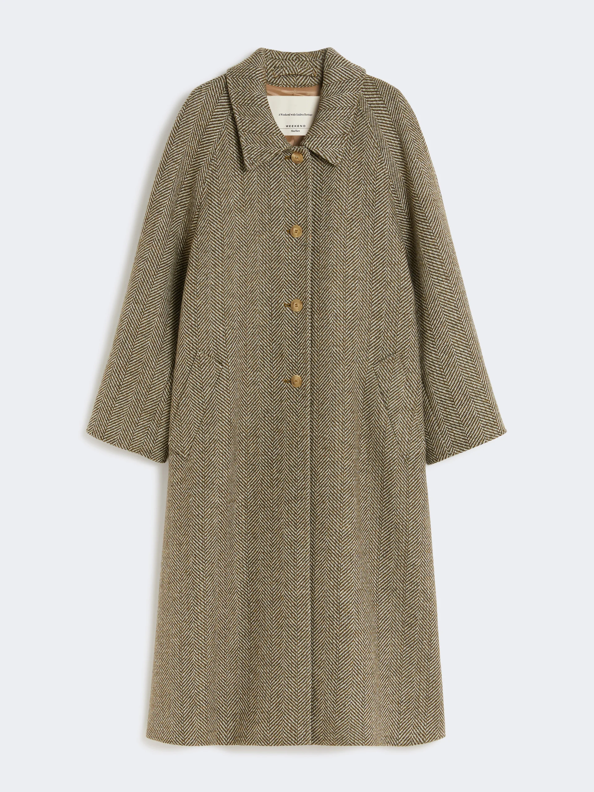 DETAILS Oversized coat in double-faced wool fabric featuring tailoring-style hand-stitched detail and a herringbone pattern. The shirt-neck garment boasts long raglan sleeves and welt pockets. It is set apart by its sculpted criss-cross detail and rear vent. Single-breasted fastening. Double-faced wool and nylon fabric Oversized fit Shirt collar Long sleeves Single-breasted fastening Welt pockets COMPOSITION AND CARE Fabric 90% virgin wool, 10% polyamide; - except joining thread; lining 50% acetate, 50% viscose. Do not wash; do not bleach; do not tumble dry; cool iron; professionally dry clean perchloroethylene - mild process; do not wet clean. Distributed by Max Mara S.r.l., registered office in Reggio Emilia (Italy), Via Giulia Maramotti 4, 42124 (IT)