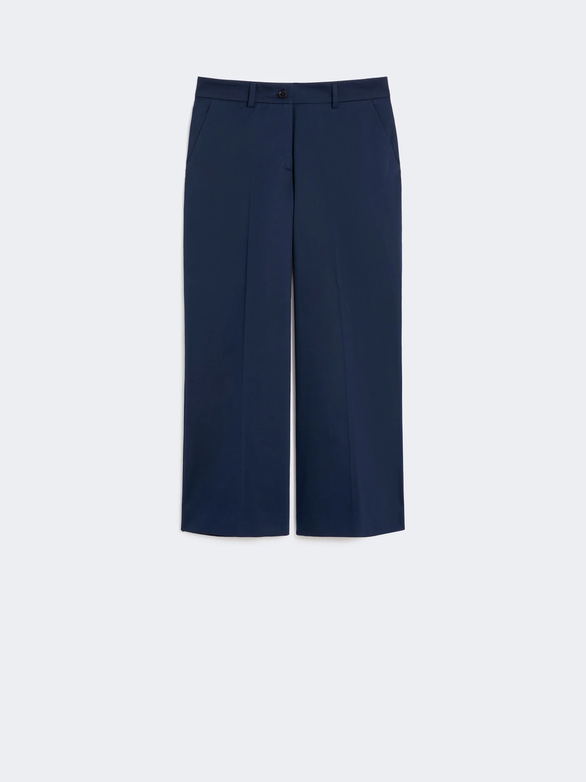 DETAILS Straight-fit tailored trousers with a cropped hem cut. Trousers in washed stretch cotton satin fabric. High-cut waistband with a fly-covered zip and button fastening Slant side pockets Buttoned welt rear pockets Pressed pleat detail on the leg Belt loop detail at the waist COMPOSITION AND CARE 96% cotton, 4% elastane. Machine wash cold delicate cycle; do not bleach; do not tumble dry; line drying in the shade; cool iron; professionally dry clean perchloroethylene - mild process. Distributed by Max Mara S.r.l., registered office in Reggio Emilia (Italy), Via Giulia Maramotti 4, 42124 (IT)