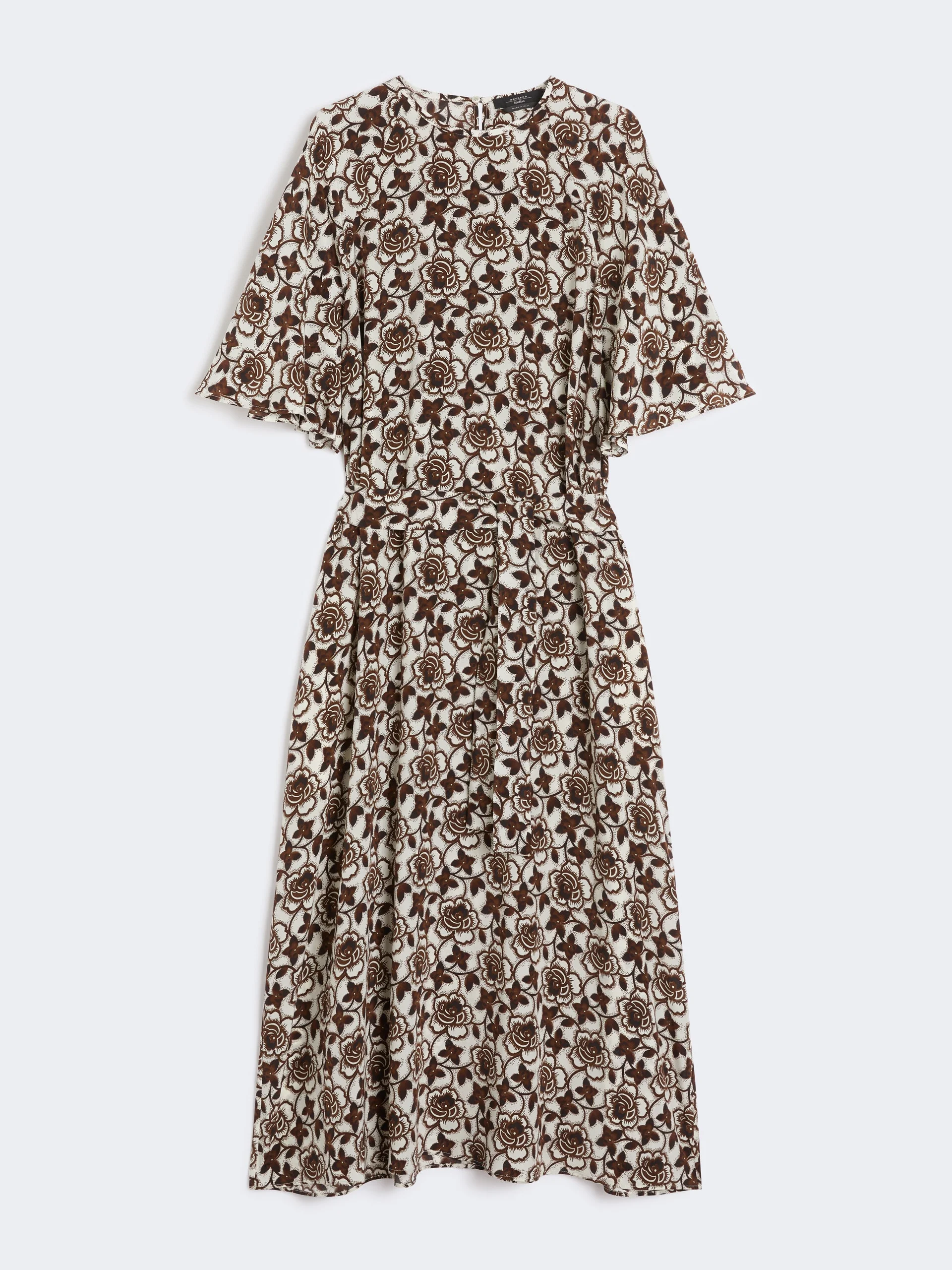 DETAILS Feminine-fit long dress with a matching waist belt. - Pure silk crepe de chine dress - Relaxed fit - Crew-neck - Wide, short kimono sleeves - Small button-fastening keyhole detail at the back - In-seam side pockets - Unlined model COMPOSITION AND CARE 100% silk. Hand wash cold; do not bleach; do not tumble dry; line drying in the shade; cool iron; professionally dry clean perchloroethylene - mild process; do not wet clean.; wash the garment while it is fastened.; contains non-textile parts of animal origin. Distributed by Max Mara S.r.l., registered office in Reggio Emilia (Italy), Via Giulia Maramotti 4, 42124 (IT)