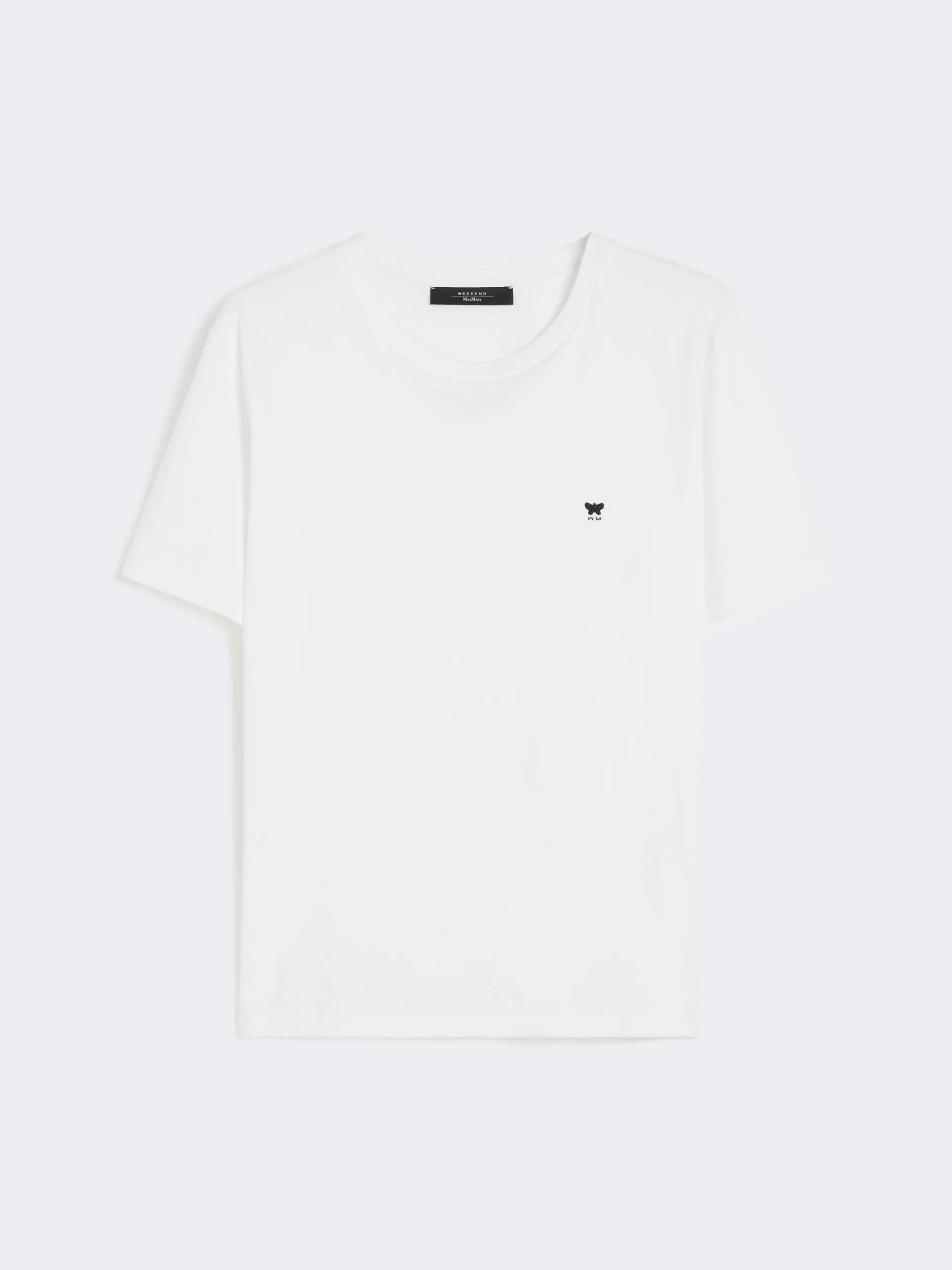 DETAILS Straight-fit basic T-shirt. Pure cotton jersey T-shirt Rib-knit crew neckline Short set-in sleeves Small embroidered butterfly logo detail on the chest Side slit-embellished hem COMPOSITION AND CARE Jersey fabric 100% cotton; - exclusive of embroideries. Machine wash cold delicate cycle; do not bleach; do not tumble dry; flat drying in the shade; cool iron; professionally dry clean perchloroethylene - mild process; professional wet cleaning - very mild process.; iron with a cloth between.; using neutral detergent. Distributed by Max Mara S.r.l., registered office in Reggio Emilia (Italy), Via Giulia Maramotti 4, 42124 (IT)