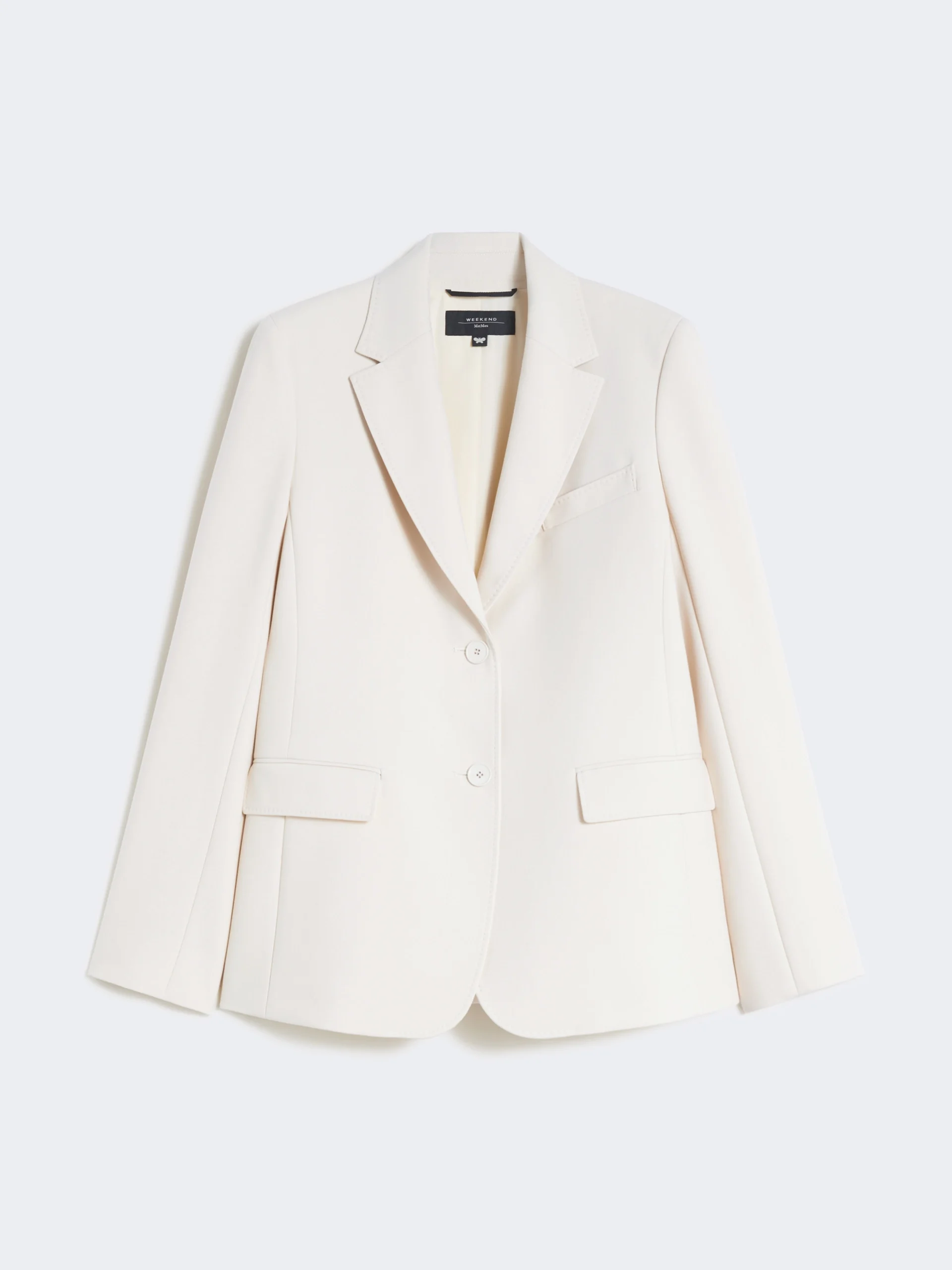 DETAILS Single-breasted blazer with a distinctive feminine fit. - Viscose-blend canvas blazer - Figure-skimming fit with a rear vent - Lapel collar and set-in sleeves with buttoned cuffs - Two-button front fastening - Breast pocket and flap welt pockets at the side - Embellished with tailored stitching - Lined model COMPOSITION AND CARE Fabric 72% polyester, 21% viscose, 7% elastane; lining 100% polyester. Do not wash; do not bleach; do not tumble dry; cool iron; professionally dry clean perchloroethylene - mild process; do not wet clean.; wash the garment while it is fastened.; protect buttons before washing.; contains non-textile parts of animal origin. Distributed by Max Mara S.r.l., registered office in Reggio Emilia (Italy), Via Giulia Maramotti 4, 42124 (IT) Collection: Weekend Max Mara Product code: 5041066106033 - WKDUVA