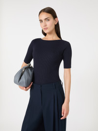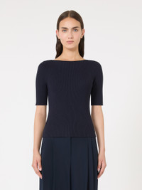 DETAILS T-shirt featuring a feminine silhouette-accentuating rib-knit pattern. Stretch viscose yarn T-shirt Slim fit Boat neckline Short set-in sleeves Regular length COMPOSITION AND CARE 77% viscose, 23% polyester. Hand wash cold; do not bleach; do not tumble dry; flat drying in the shade; cool iron; professionally dry clean perchloroethylene - mild process; do not wet clean.; iron with a cloth between.; using neutral detergent. Distributed by Max Mara S.r.l., registered office in Reggio Emilia (Italy), Via Giulia Maramotti 4, 42124 (IT)