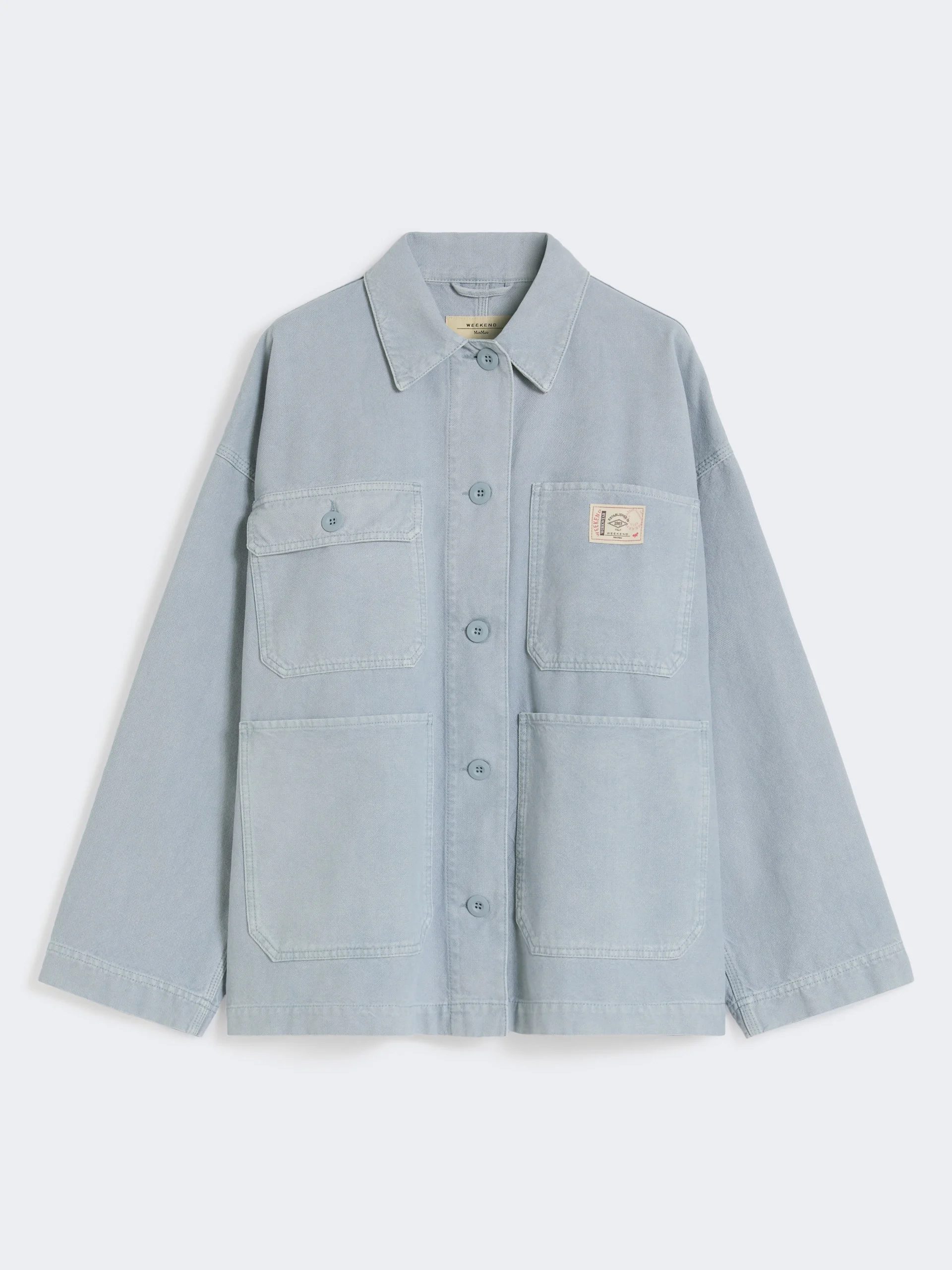 DETAILS Workwear-inspired single-breasted jacket featuring branded label detail on the left breast pocket. - Jacket in garment-dyed pure cotton canvas - Loose fit - Shirt collar - Long sleeves with dropped shoulders - Visible button fastening on the front - Four patch pockets on the front, one with flap and button - Unlined model COMPOSITION AND CARE 100% cotton. Machine wash cold delicate cycle; do not bleach; do not tumble dry; line drying in the shade; cool iron; professionally dry clean perchloroethylene - mild process.; wash the garment while it is fastened.; wash separately.; do not iron the buttons.; protect buttons before washing.; turn the articles inside out before washing.; dyed article. the unevennes of the dye and the pressing form its characteristic.; this item may leave colour stains on brightly-coloured garments. Distributed by Max Mara S.r.l., registered office in Reggio Emilia (Italy), Via Giulia Maramotti 4, 42124 (IT) Collection: Weekend Max Mara Product code: 5041106106002 - WKDALBUM