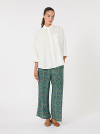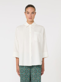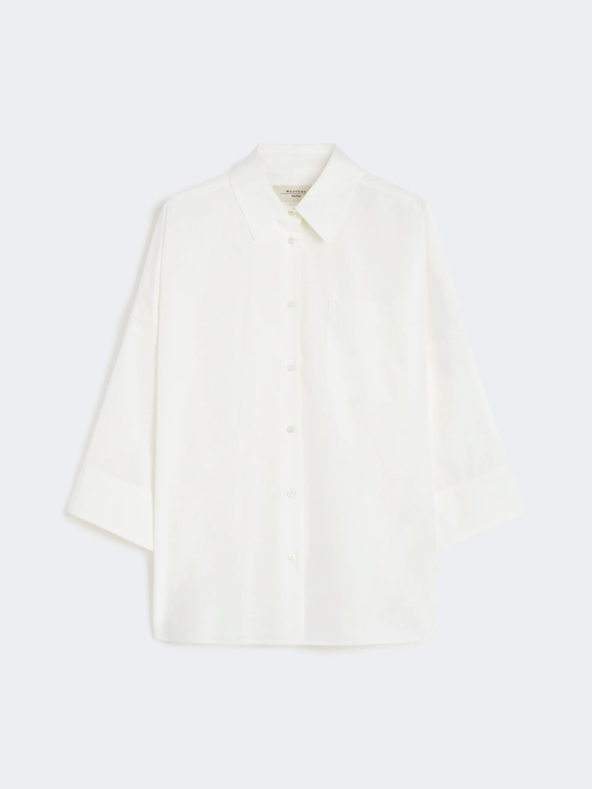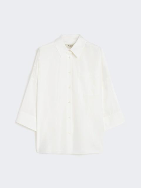 DETAILS Oversized shirt featuring a small embroidered butterfly logo on the left hem. Main fabric with cotton fibers, grown and processed according to organic farming systems Pure cotton poplin shirt Classic pointed collar Loose-fitting low set-in 3/4 sleeves Visible button fastening on the front Rounded patch breast pocket Pleated wide yoke on the back Squared-off side slits COMPOSITION AND CARE Fabric 100% cotton; - exclusive of embroideries. Machine wash cold delicate cycle; do not bleach; do not tumble dry; line drying in the shade; cool iron; professionally dry clean perchloroethylene - mild process.; wash the garment while it is fastened.; turn the articles inside out before washing.; contains non-textile parts of animal origin. Distributed by Max Mara S.r.l., registered office in Reggio Emilia (Italy), Via Giulia Maramotti 4, 42124 (IT)