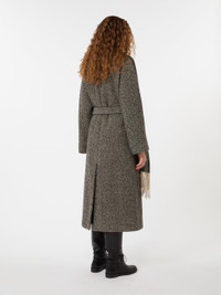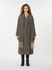 DETAILS Long robe overcoat featuring a removable scarf in matching fabric with a fringed pattern at the hem and a customised label. Wool tweed coat with Chevron design Straight lines and central slit at the back Crossed V neck Long kimono sleeves Matching belt fastening Welt pockets on the sides Partially lined COMPOSITION AND CARE Coat fabric 98% virgin wool, 2% polyamide; lining 50% acetate, 50% viscose. Scarf 98% virgin wool, 2% polyamide. Coat: do not wash; do not bleach; do not tumble dry; cool iron; professionally dry clean perchloroethylene - mild process; do not wet clean. Scarf: do not wash; do not bleach; do not tumble dry; cool iron; professionally dry clean perchloroethylene - mild process; do not wet clean.; Please restore fringes after washing. Distributed by Max Mara S.r.l., registered office in Reggio Emilia (Italy), Via Giulia Maramotti 4, 42124 (IT)