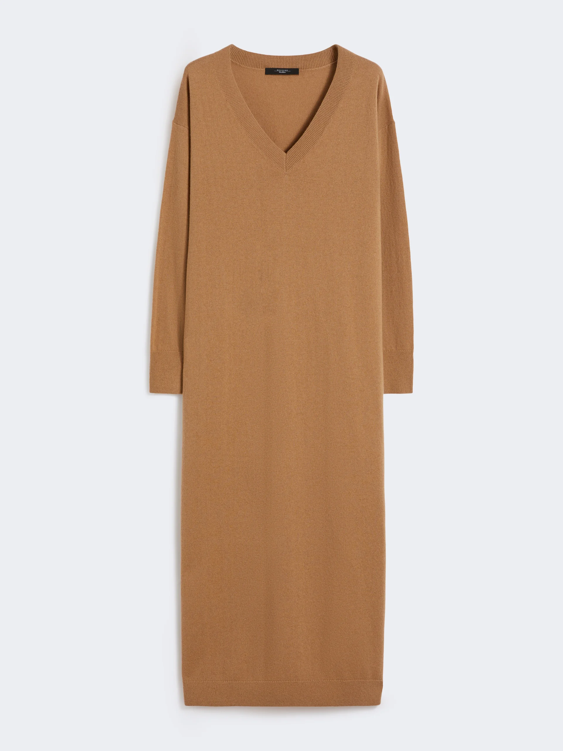 DETAILS Long dress with a loose fit and a slit at the hem, on the left side as worn. Wool and cashmere plain-knit dress Oversized fit V neck Long sleeves with dropped shoulders Ribbed trim COMPOSITION AND CARE 80% wool, 20% cashmere. Hand wash cold (40°c max); do not bleach; do not tumble dry; flat drying in the shade; cool iron; professionally dry clean perchloroethylene - mild process; do not wet clean.; iron with a cloth between.; using neutral detergent. Distributed by Max Mara S.r.l., registered office in Reggio Emilia (Italy), Via Giulia Maramotti 4, 42124 (IT)
