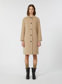 DETAILS Straight-fit long single-breasted coat. Coat in hand-sewn double-faced pure wool broadcloth Shirt collar Long set-in sleeves Visible button fastening on the front Vertical-welt pockets on the sides Central rear slit COMPOSITION AND CARE Fabric 100% virgin wool; - except joining thread; lining 52% polyester, 48% viscose. Do not wash; do not bleach; do not tumble dry; cool iron; professionally dry clean perchloroethylene - mild process; do not wet clean. Distributed by Max Mara S.r.l., registered office in Reggio Emilia (Italy), Via Giulia Maramotti 4, 42124 (IT)