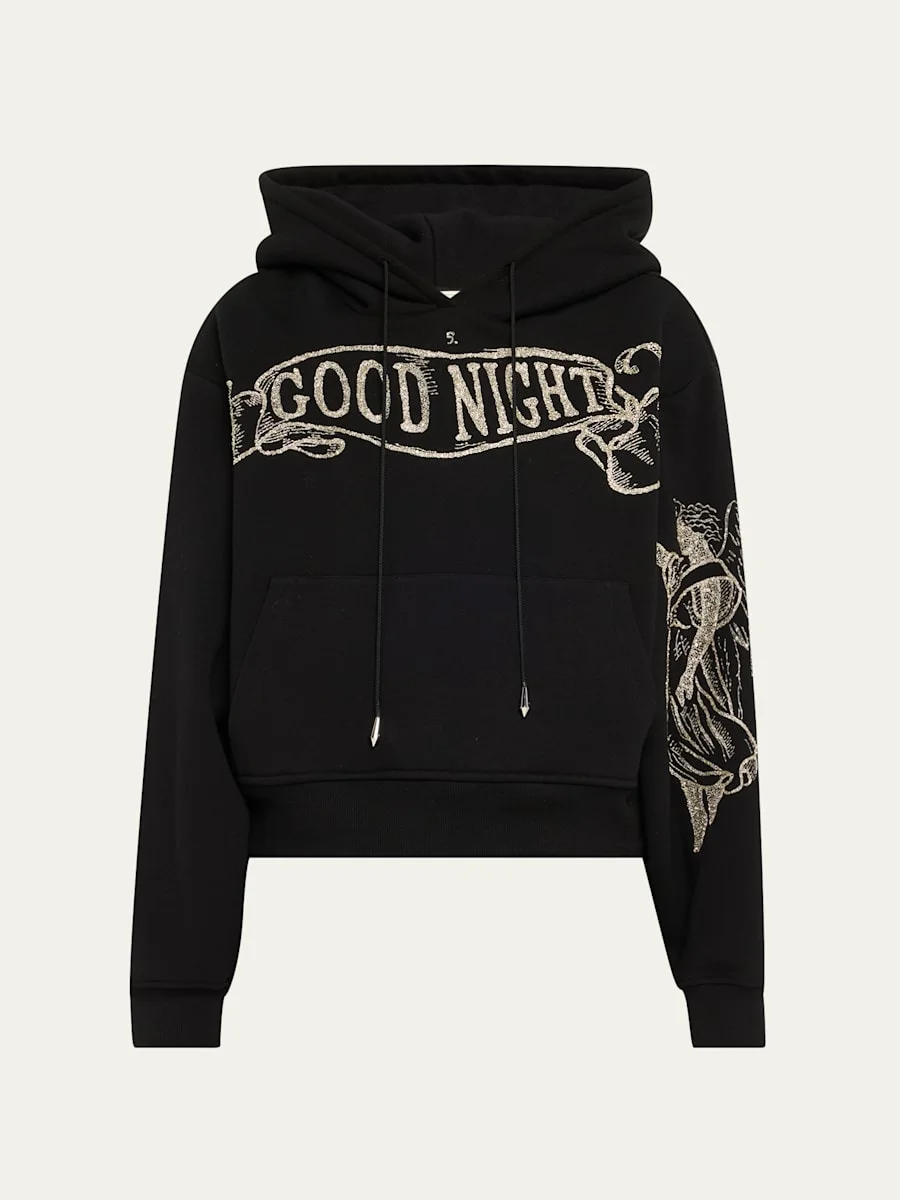 Wiederhoeft hoodie with hand-embroidered "Good Night" typography across the front Crew neckline with drawstrings Long Sleeve Oversized fit Cropped length Kangaroo pockets Slipover style Cotton Dry clean Made in USA from imported materials Online Inquiries: BGS21_B9Y8E| Store Inquiries: #4999451