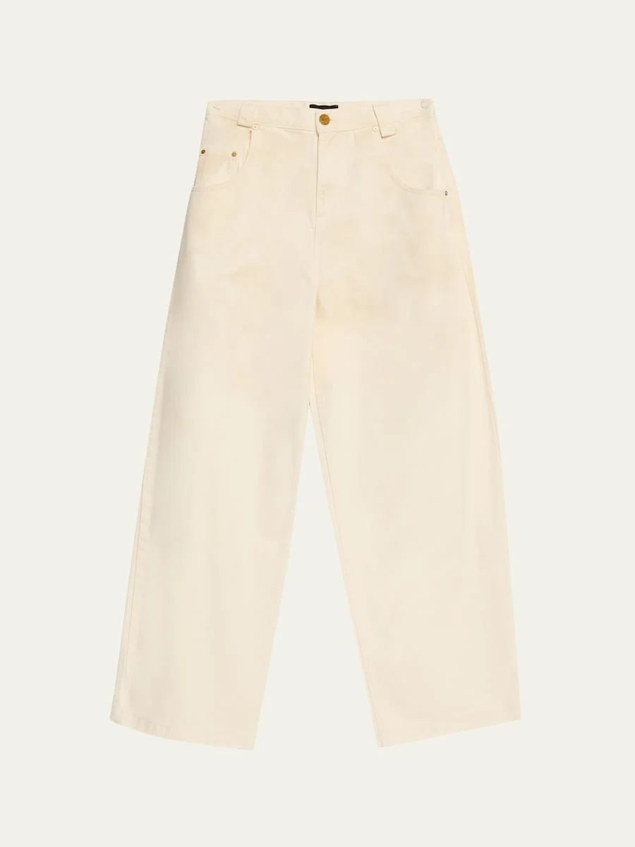 Rendered from durable cotton denim, the Willy Chavarria "Bad Girl" jeans flaunt a tapered hem for a timeless silhouette and signature snake "W" antique brass buttons. Belt loop waistband Fivepocket style Willy logo patch Tapered legs Button; zip fly Cotton Made in USA SIZE amp; FITModel measurements: 5'10" tall Model is wearing a US size 4/Small