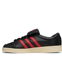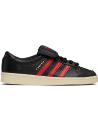 Buffed leather sneakers. · Rubber cap toe · Lace-up closure · Logo patch at foldover tongue · Padded collar · Perforations and signature serrated stripes at sides · Text stamp at outer side · Leather lining · Logo stamp at heel tab · Rubber sole Part of the Willy Chavarria x adidas Originals collaboration. Supplier color: Core black/Core black/Red Upper: leather. Sole: rubber. Made in Indonesia 252232F128002