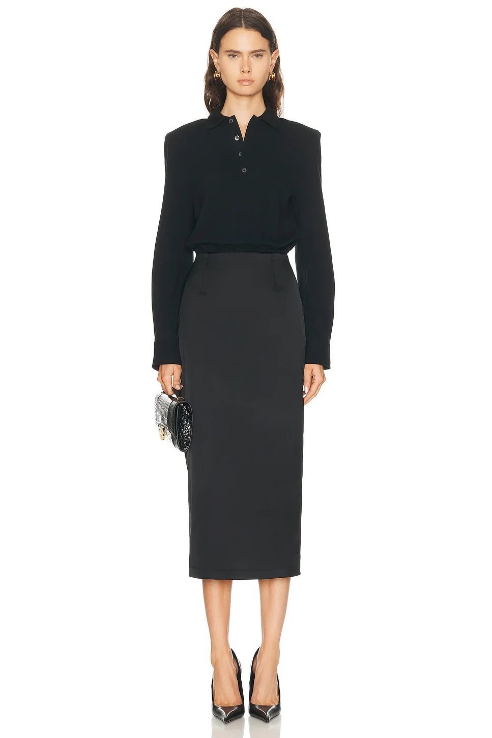 Details - Self & Lining: 100% cotton - Contrast Fabric: 74% acrylic, 23% polyamide, 3% elastane - Dry clean only - Partially lined - Hidden side zip closure - Front partial button design - Padded shoulders - Button cuffs - Heavyweight satin skirt with pique bodice - Made in US - Our Style No. WCHV-WD2 - Manufacturer Style No. WCDRS0016-001
