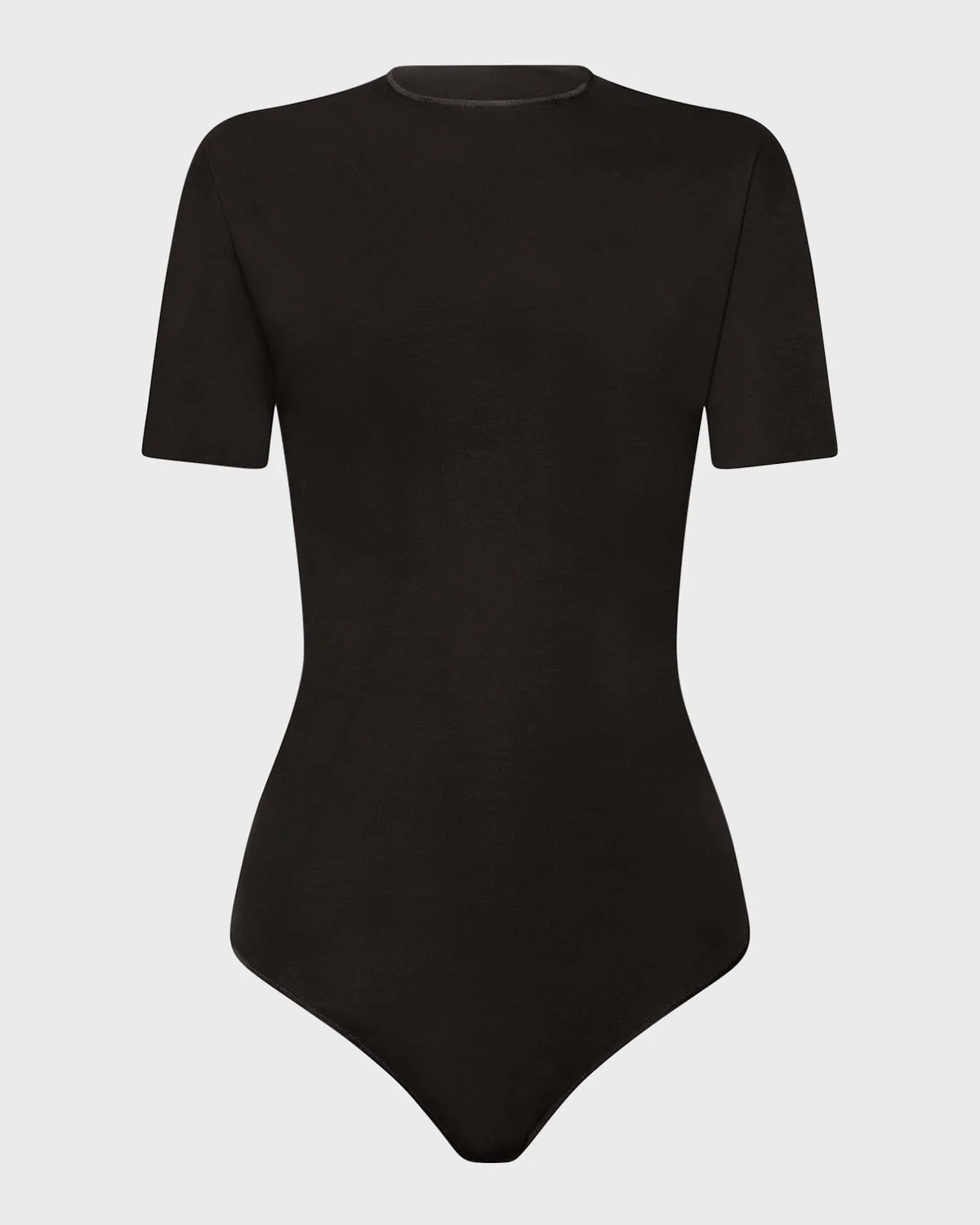 Wolford "Aurora" Tshirt bodysuit in gold Certified® Aurora Pure jersey Round neckline Short sleeves Formfitting silhouette Thong seat coverage Snap gusset Modal/nylon/polyamide/elastane Machine wash Made in Austria