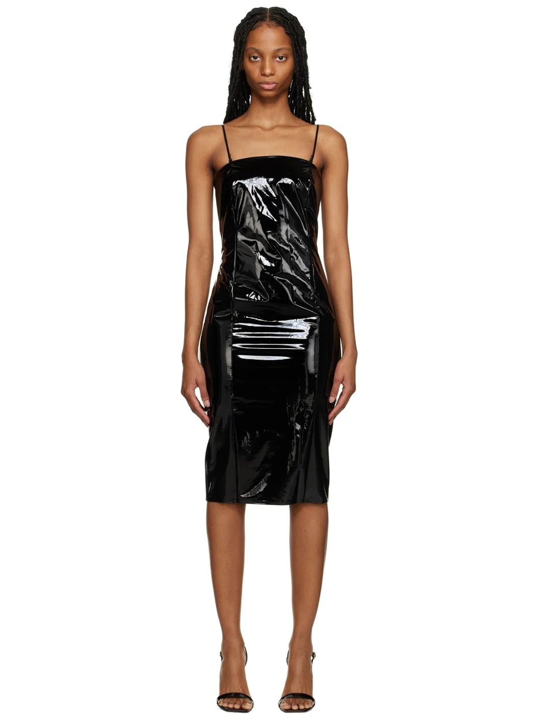Coated stretch viscose-blend jersey dress. · Paneled construction · Elasticized square neck · Adjustable and detachable spaghetti straps · Partial stretch jersey lining Supplier color: Black Body 1: 100% polyurethane. Body 2: 95% polyester, 5% elastane. Body 3: 69% viscose, 25% polyamide, 6% elastane. Lining: 79% polyamide, 21% elastane. Made in Slovenia 231017F054000