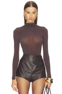 - 86% polyamide 14% elastane - Machine wash - Snap gusset closure - Turtleneck design - Thong back - Lightweight jersey fabric - Garment is made with a semi-sheer fabric, undergarments can show through - Revolve Style No. WFOR-WS119 - Manufacturer Style No. 78313