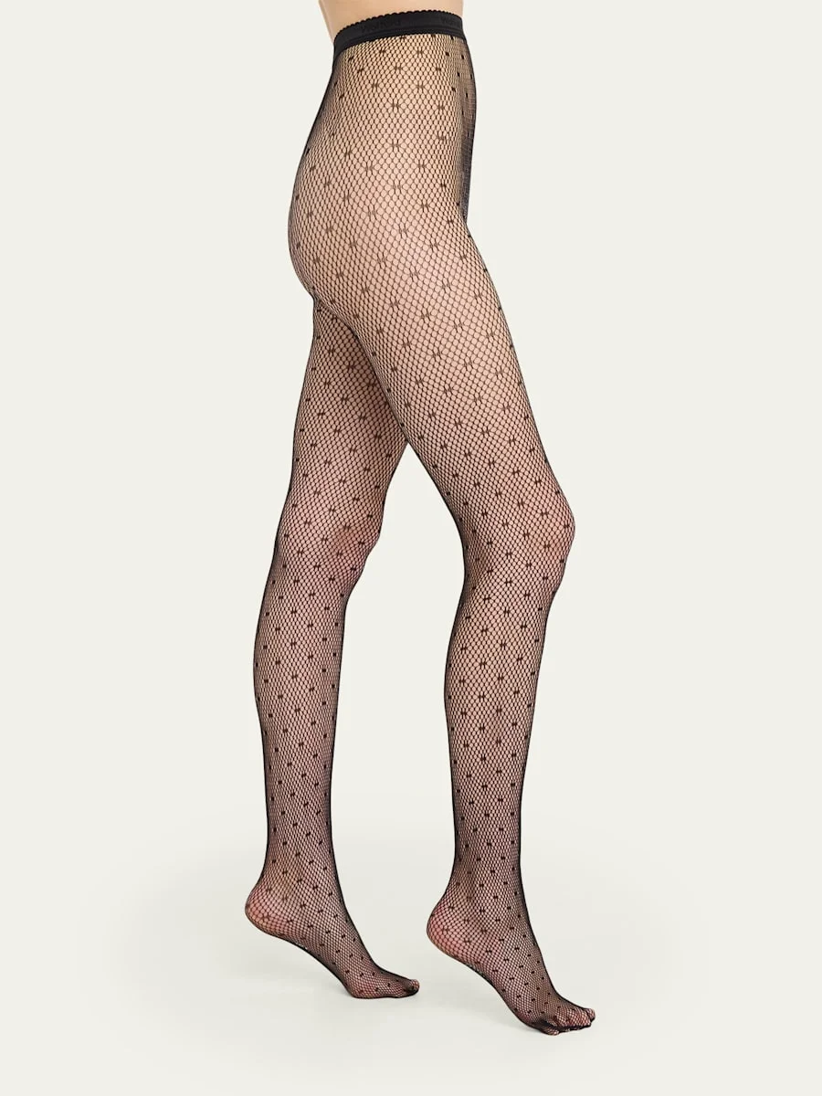 These Wolford "Dotted Net" tights showcase a warpknit mesh construction for a polka dot pattern Elasticized logo waistband Nylon/polyamide/elastane Made in Slovenia SIZE amp; FITModel measurements: 5'10" tall Model is wearing a US size 4/Small