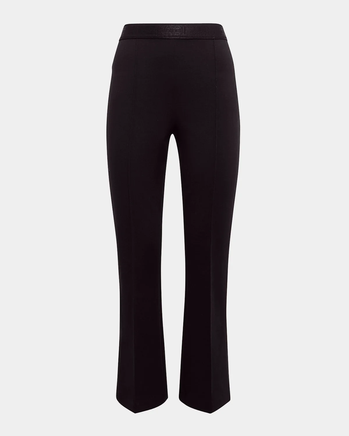 Wolford "Grazia" jersey trousers Elasticized logo waistband Sewnin pintuck at the front Fitted through hips and thighs Slightly flared from knee Full length Pullon style Viscose/polyamide/elastane Imported