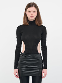 WOLFORD x N°21 bodysuit in black, bio-degradable stretch fabric, matte finish, turtleneck, long sleeves, open back & sides, drape details, string bottom, free-cut edges, fitted. Standard Sizing 89% Modal, 11% Elastane Model is 5'10" wearing size XS. Bust: 32" Waist: 24" Hips: 35"