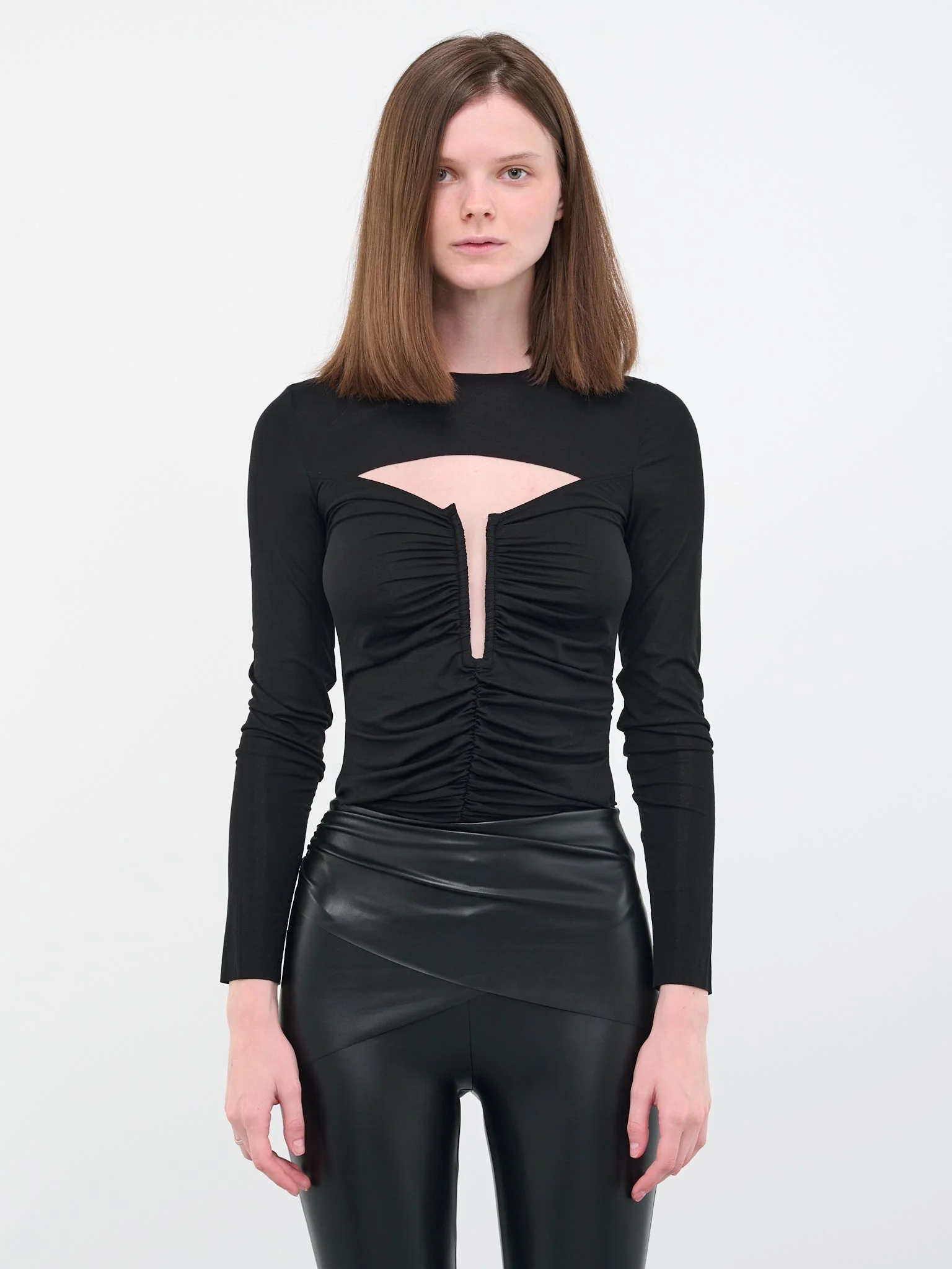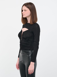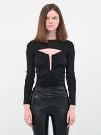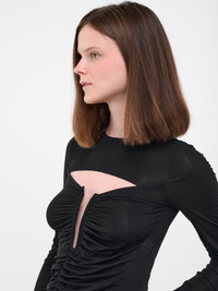 WOLFORD x N°21 bodysuit in black, structured design, bio-degradable stretch fabric, matte finish, wired bodice, plunging neck, cut-out, draped details, long sleeves, free-cut edges, fitted. Standard Sizing 89% Modal, 11% Elastane Model is 5'10" wearing size S. Bust: 32" Waist: 24" Hips: 35"