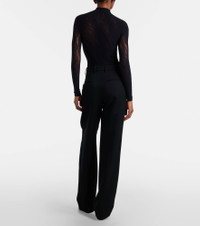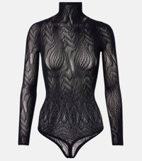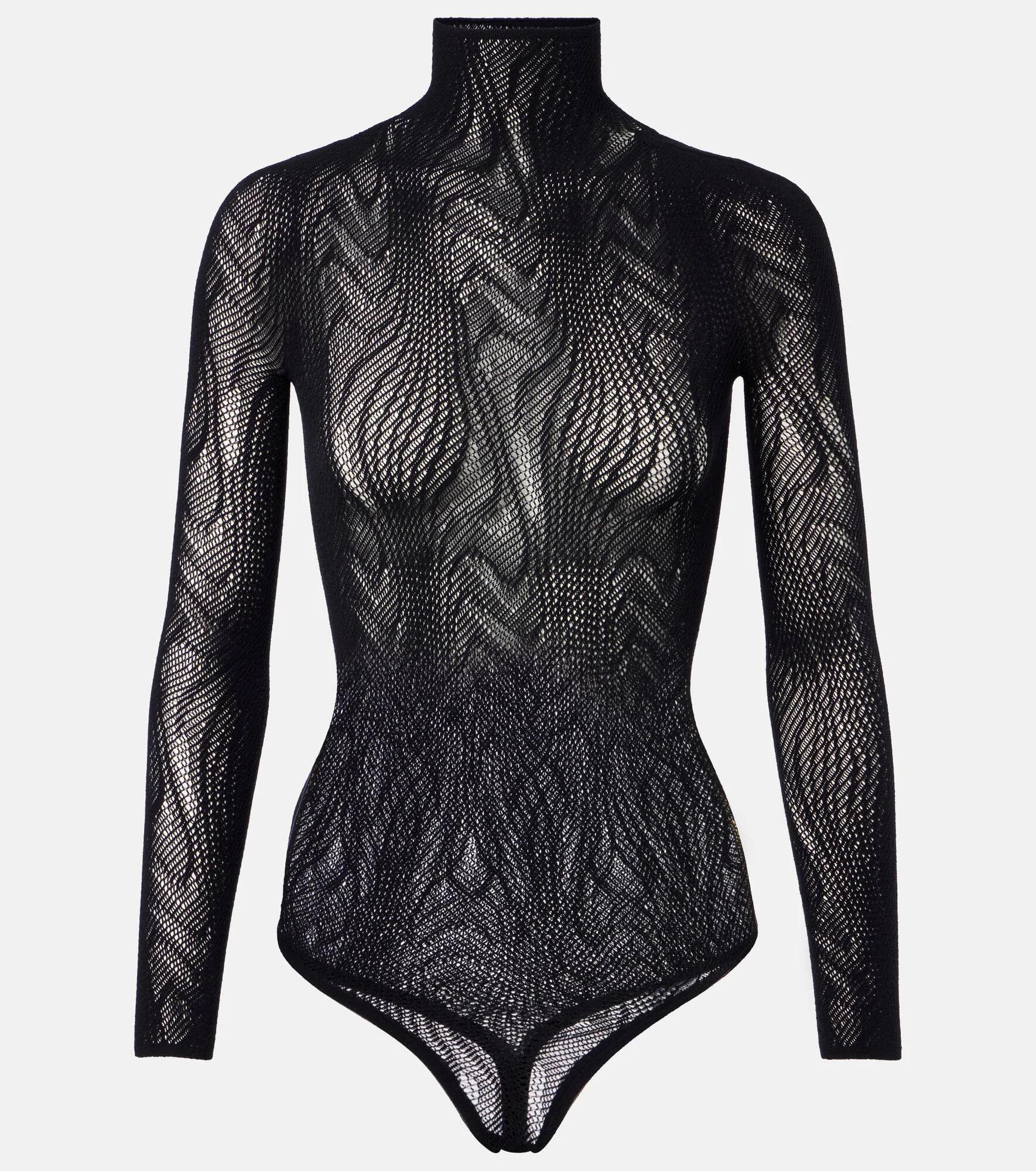 This alluring snake-inspired bodysuit from Wolford is crafted from sheer mesh and designed to contour with a striking silhouette. Featuring a high neckline, thong bottom, and raw-edged sleeve hems, this piece makes a bold statement. Product Details - Material: 83% polyamide, 17% elastane - Care instructions: machine wash at 30 degrees - Made in Italy - Designer color name: Black - Item color: black - Item number: P01024668 Size & Fit - True to size - Semi-sheer - Fitted - Stretchy fabric - High-cut leg - The model seen in the picture is 178cm-5'10" and wearing a size XS