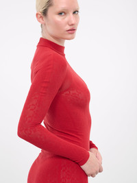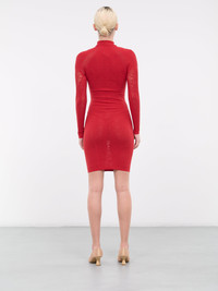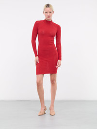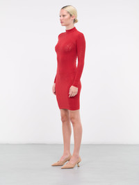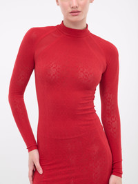 WOLFORD x SIMKHAI red dress, double layer construction, sustainable Econyl yarn, semi-sheer, jacquard logo pattern, mock neck, long sleeves, mini length, fitted. 83% Polyamide, 17% Elastane Standard Sizing Model is 5'9" wearing size S. Bust: 32" Waist: 24" Hips: 34"