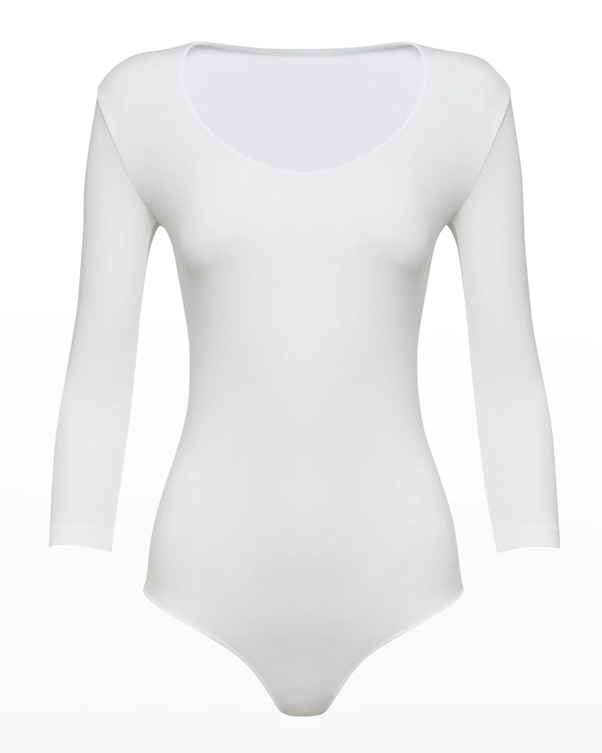 Wolford "Tokio" luxe solid bodysuit Scoop neckline 3/4 sleeves Formfitting silhouette Thong seat coverage Snap gusset Modal/polyamide/elastane Made in Slovenia