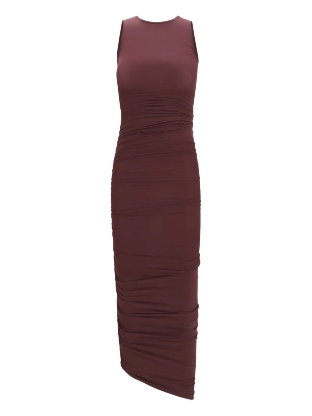 drape sheer midi dress Highlights - Brown - Sleeveless - Round neck - Asymmetric hem Imported Composition Polyamide 86%, Elastane 14% Washing instructions Read Manufacturer Guidelines