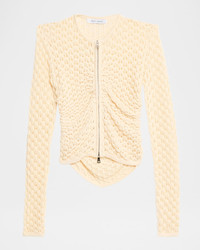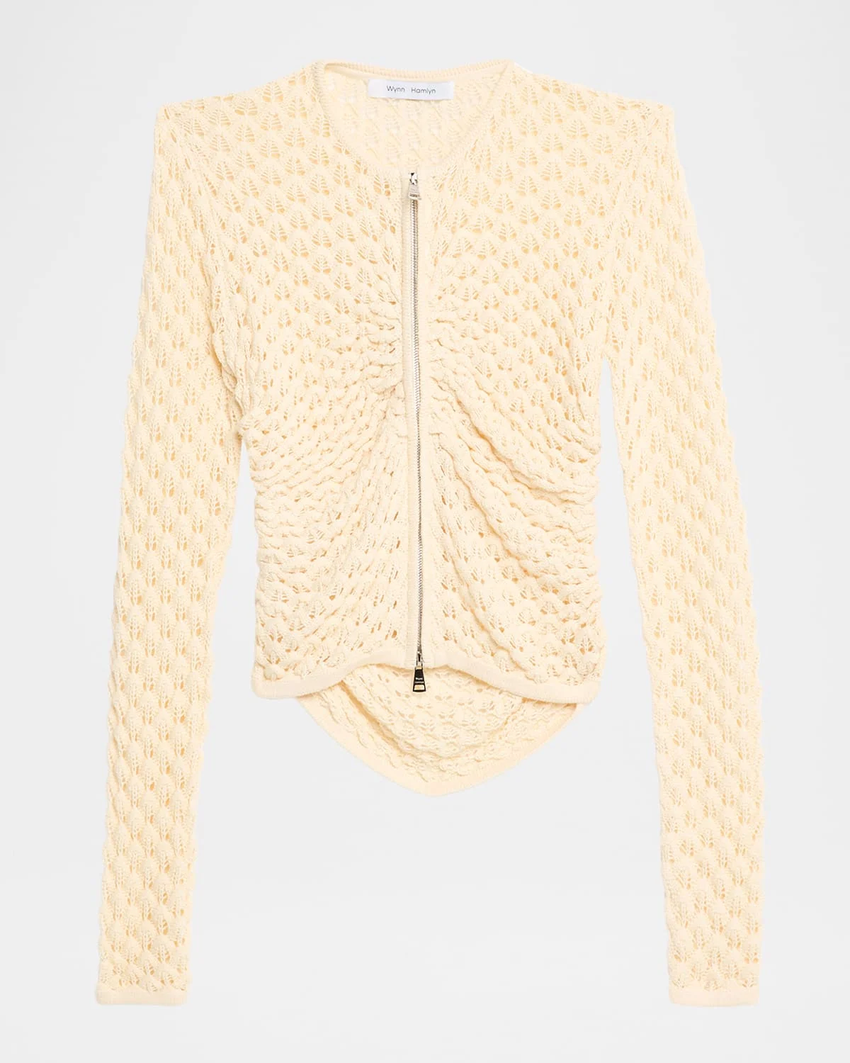 Crafted in a delicate pointelle knit, this Wynn Hamlyn cardigan is adorned with flattering ruching and a twoway zipfront for versatile styling. Crew neckline Long sleeves; approx. 29"L Fitted Hem sits at the hip Acrylic/cotton Dry clean Imported