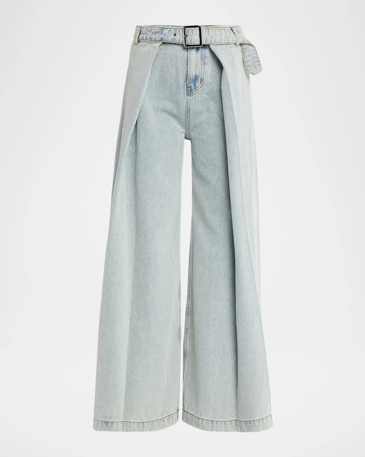 Wynn Hamlyn utility jeans enhanced with a wrap front Approx. 13.1" rise; 29.7" inseam High rise Adjustable belt Back patch pockets Wide leg Full length Button/zip fly; belt loops Cotton Trim: Metal Dry clean Imported