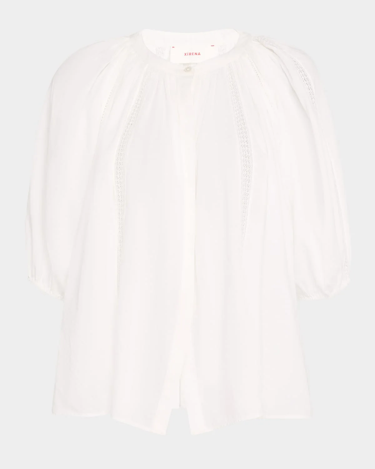 Xirena "Evynn" ruched shirt in cotton with lace inset Approx. 22.5"L from shoulders to hem Band collar; concealed button front Elbow raglan blouson sleeves Elasticized cuffs Relaxed fit Cotton Machine wash cold Imported