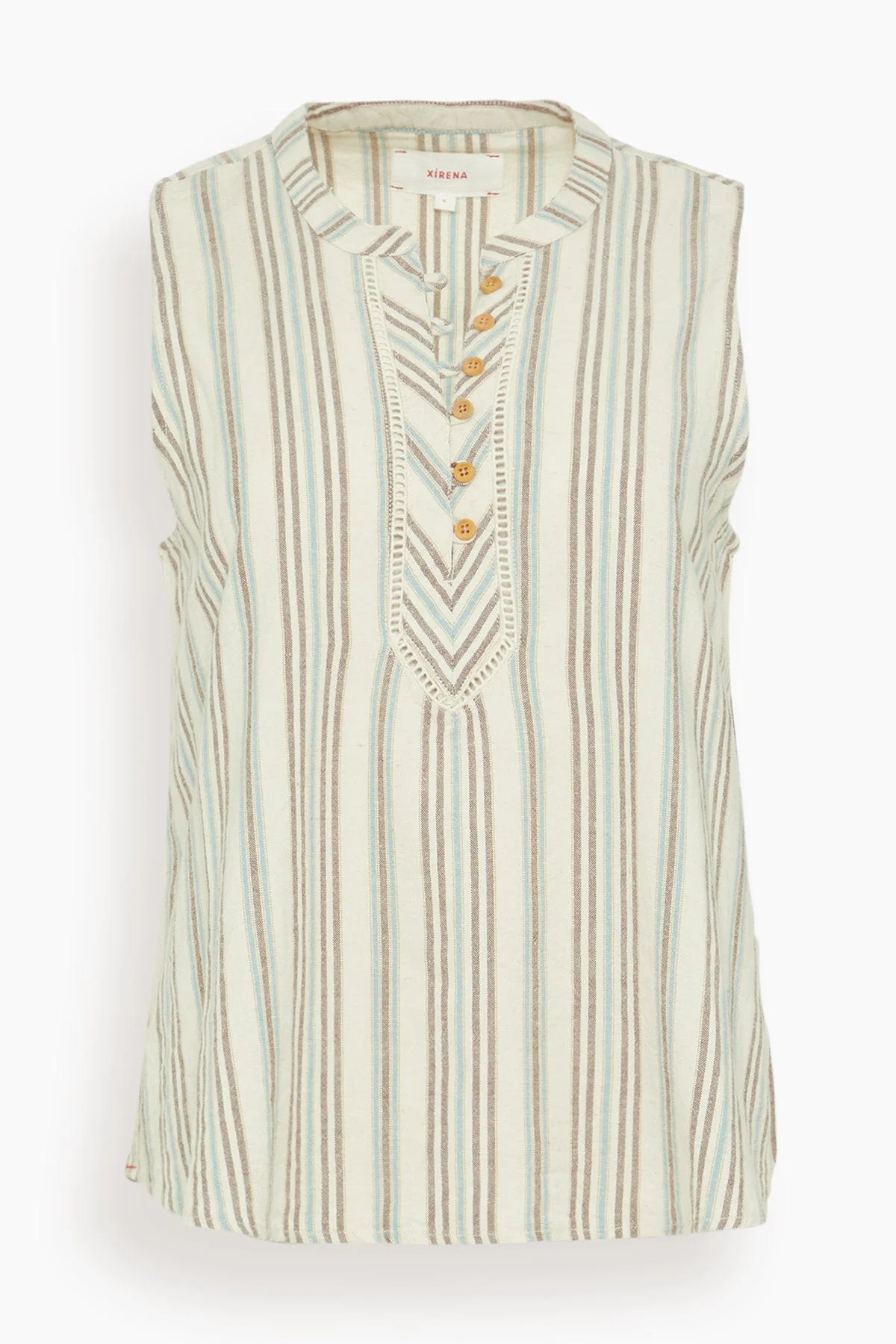 The Xirena Twyla Top is a must-have piece from their PreFall 25 Collection. This sleeveless top is crafted in a striped cotton with a button front. Wear yours with trousers and sandals. FIT DESCRIPTION MODEL MEASUREMENTS - Fits true to size, take your normal size - Sleeveless top - Relaxed fit - Half button front - Band collar - 100% Cotton - Rayna is wearing a size XS - Bust: 34” - Waist: 24” - Hips: 32” - Height: 5’8.5”