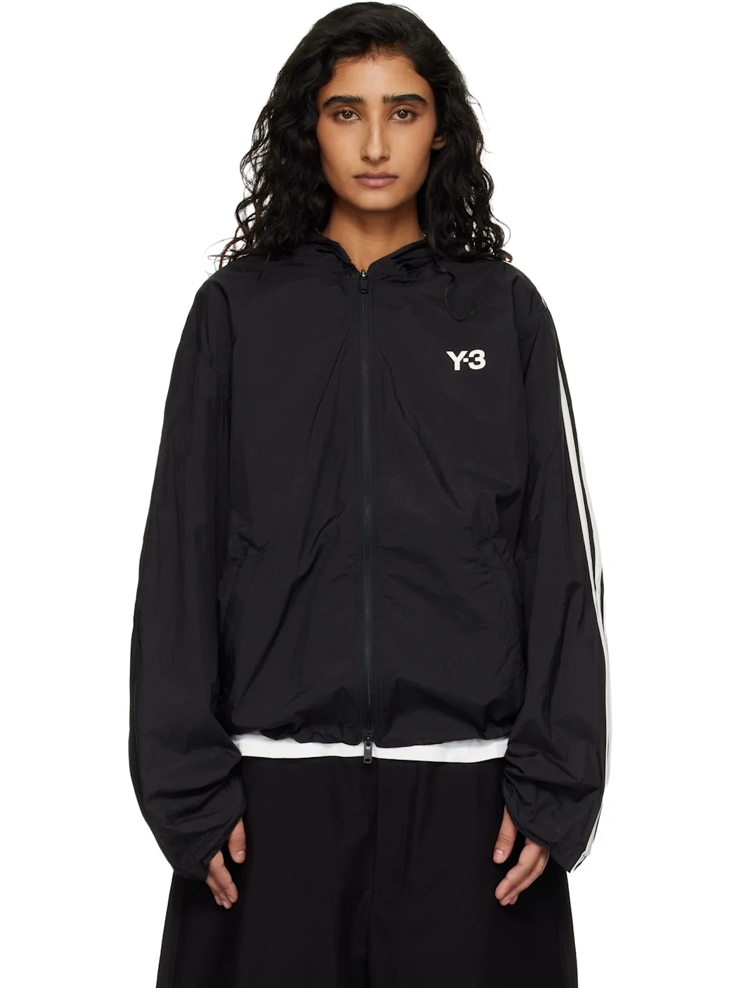 Nylon taffeta jacket. · Integrated wire trim at hood, sleeves, and cuffs · Zip closure · Logo bonded at chest · Welt pockets at waist · Bungee-style drawstring at hem · Stripes at hood and sleeves · Unlined Supplier color: Black 100% polyamide. Made in Viet Nam 261138F097000