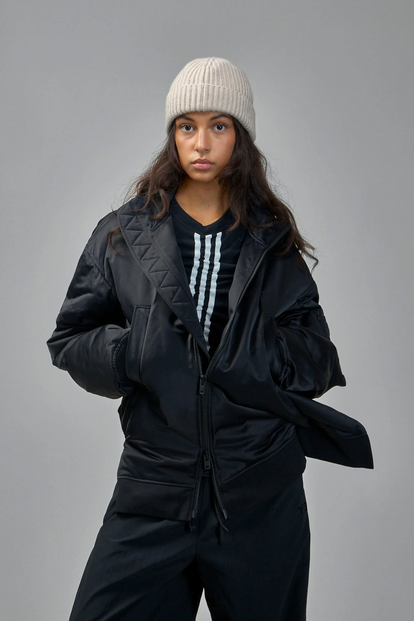 SKU: 152058 Bomber jacket with a boxy, slightly padded silhouette in matte black. It has a full-length front zipper, stand-up collar, ribbed cuffs and hem, vertical welt pockets, and a zipped utility pocket on the sleeve. - Black satin-like outer shell - Full-length front zipper - Stand-up ribbed collar - Vertical welt hand pockets - Zip utility pocket on sleeve - Ribbed cuffs and hem - Slightly padded boxy silhouette Materials: Color: Black