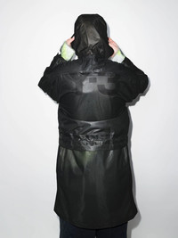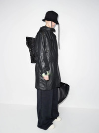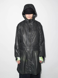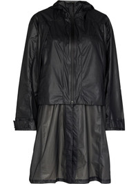 hooded midi raincoat black panelled design logo print to the rear stand-up collar classic hood front zip fastening long sleeves straight hem mid-length Imported Composition Outer: Polyamide 100%, Polyurethane 100% Lining: Polyamide 94%, Spandex/Elastane 6% SIZE & FIT Model measurements Height 5 ft 9 in(1.76 m) Bust/Chest 33.46 in(85 cm) Hips 37.79 in(96 cm) Waist 25.59 in(65 cm) FittingInformation This piece fits true to size. We recommend you get your regular size Cut for a loose fit Made with a mid-weight fabric Washing instructions Machine Wash