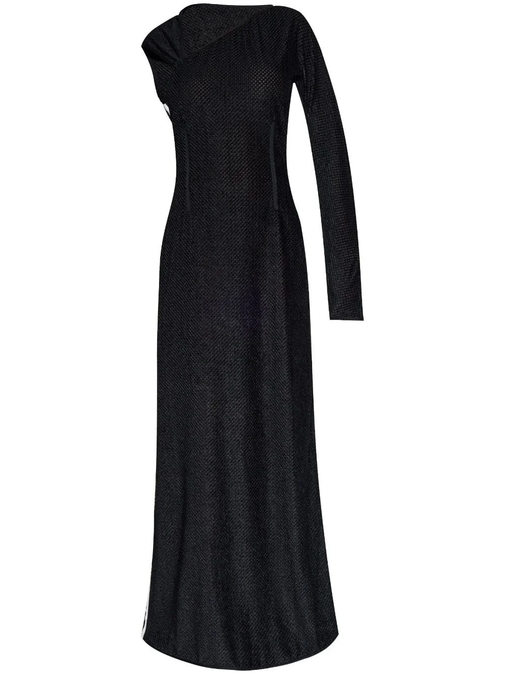 stripe-detailing one-shoulder maxi dress Highlights - Black - Asymmetric neck - One-shoulder - Single long sleeve - Side stripe detailing - Sleeveless - Straight hem - Pull-on style - Long length Imported Composition Polyester 100%